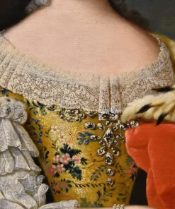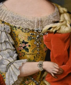 Nella nostra tela l’Altezza Reale è vestita con un abito da rappresentanza, profilato da pizzo e da broccato, le spalle sono avvolte da un mantello di velluto rosso con un risvolto di ermellino e molti gioielli preziosi, tra orecchini ed un fermaglio tra i capelli con brillanti a goccia ed un prezioso bracciale a tre fili di perle con il ritratto con un cammeo con il ritratto del consorte, dettaglio di eccezionale raffinatezza.