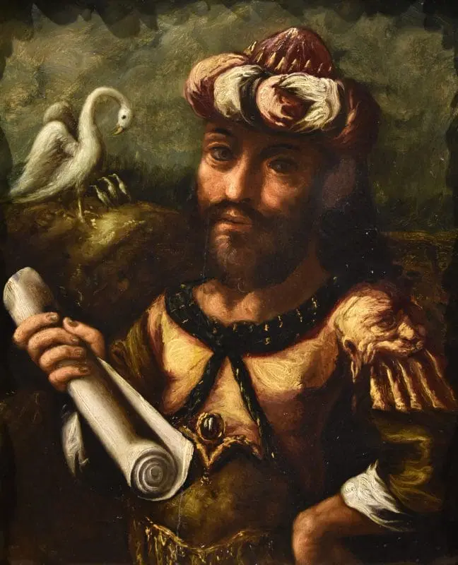 L’opera appartiene ad una serie di tre dipinti, insieme ai ritratti degli alchimisti Ermete Trismegisto (link) e Morieno Romano (link)
