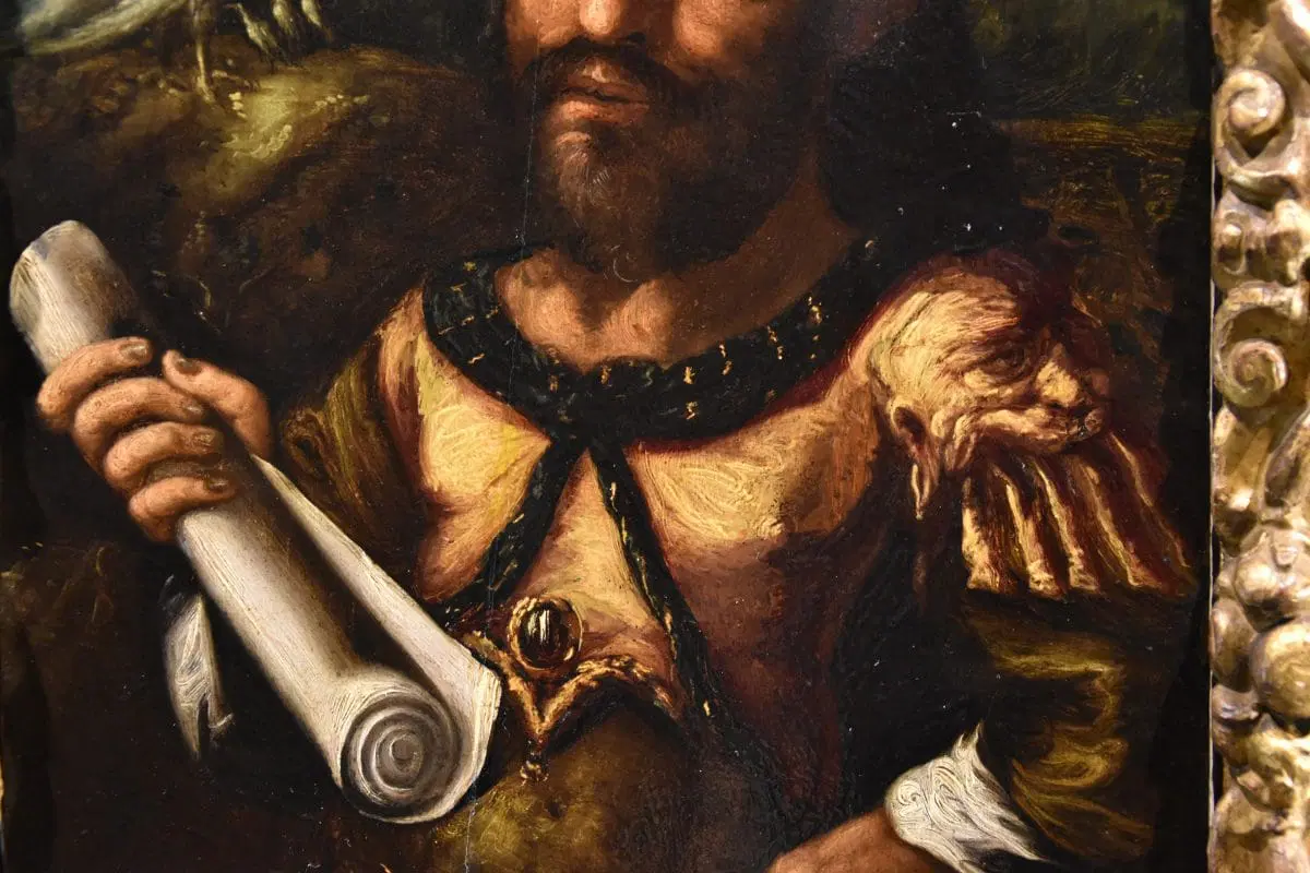 Il dipinto ritrae un alchimista, antica figura da sempre portatrice di fascino e mistero per la sua perfetta commistione tra scienza ed esoterismo, che mirava a conquistare l’onniscienza, ovvero il massimo della conoscenza in tutti i campi del sapere. Tra i grandi obiettivi dell’alchimia vi era la ricerca dell’elisir della vita eterna o la trasformazione dei metalli poveri in oro, pratica che si riteneva fosse raggiungibile attraverso la “pietra filosofale”.