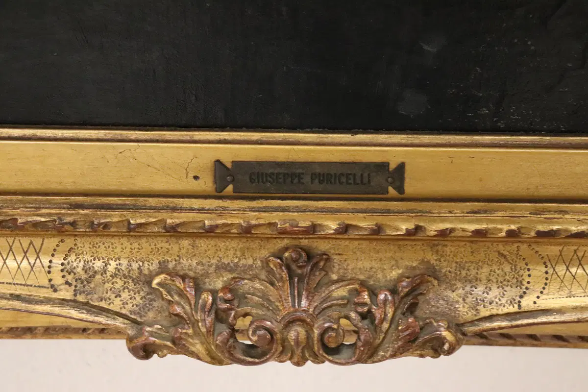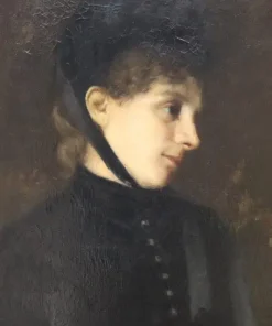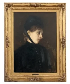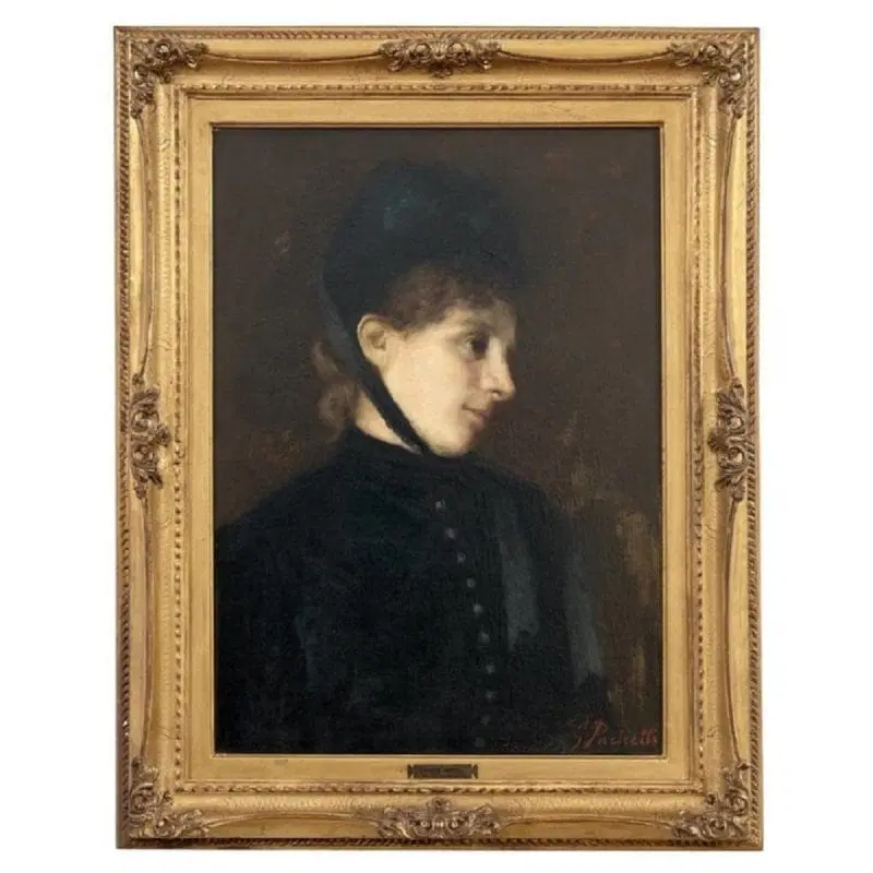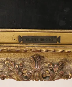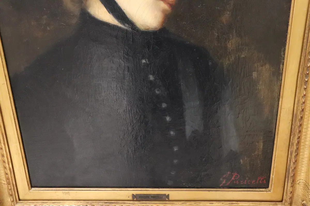 Questo squisito ritratto di giovane donna del XIX secolo offre uno sguardo affascinante sulla sensibilità artistica dell’epoca. Firmato in basso a destra in rosso da G. Puricelli, il dipinto è attribuibile al pittore italiano Giuseppe Puricelli, nato a Gallarate (Italia) il 4 settembre 1825 e morto a Casirate d’Adda (Italia) il 17 luglio 1894, come indicato dalla targa sulla cornice, dipinto privo di autentica. Il ritratto rappresenta una giovane donna vestita con abiti semplici ma eleganti, completata da un cappello nero alla moda, che incarna perfettamente lo stile dell’epoca. La scelta dell’artista di ritrarla di tre quarti, con la testa leggermente chinata e uno sguardo contemplativo, evoca un senso di mistero e introspezione che invita l’osservatore a cogliere la profondità del personaggio. L’influenza espressionista dell’opera è evidente, con forti sfumature emotive che elevano il ritratto oltre la mera rappresentazione fisica. La capacità dell’artista di trasmettere il mondo interiore del soggetto attraverso dettagli delicati e un abile gioco di luci e ombre testimonia la sua notevole abilità e visione artistica. Accompagnato da una splendida cornice in legno dorato, il ritratto è stato rintelato, garantendo la sua conservazione per le generazioni future. Questo pezzo costituirebbe un’importante aggiunta a qualsiasi collezione di ritratti di antichi maestri, offrendo un eccezionale esempio di ritrattistica del XIX secolo che risuona con emozione e maestria. Non lasciatevi sfuggire l’opportunità di possedere un’opera che parla non solo di bellezza, ma anche di un’epoca e di una sensibilità artistica senza tempo.