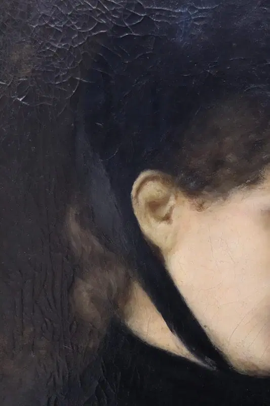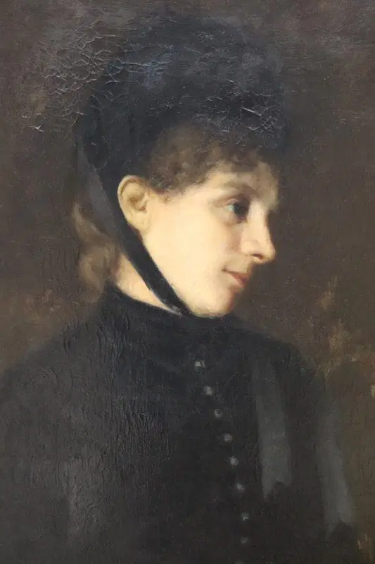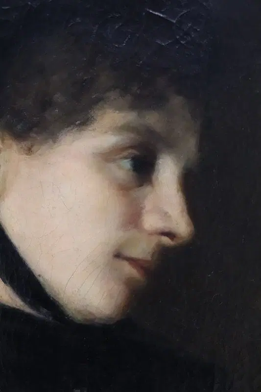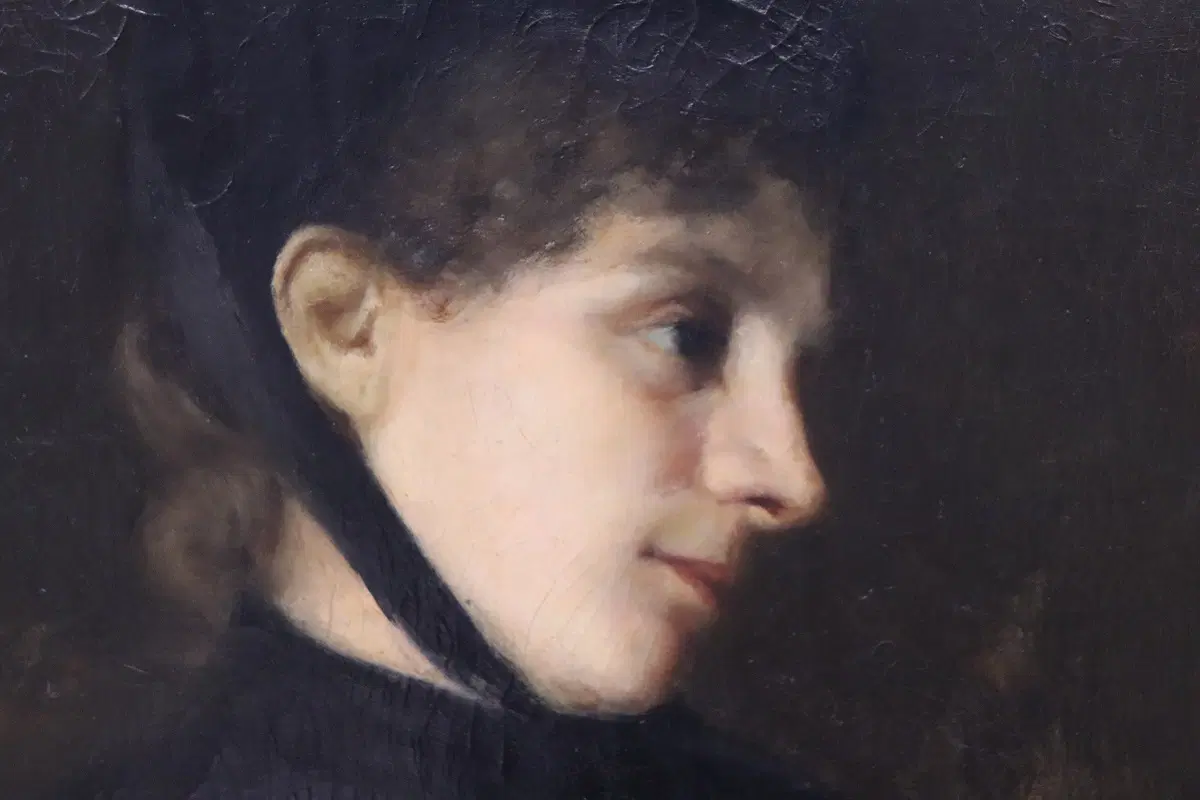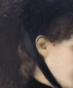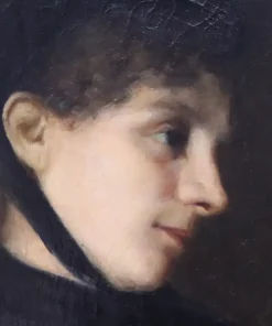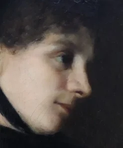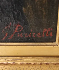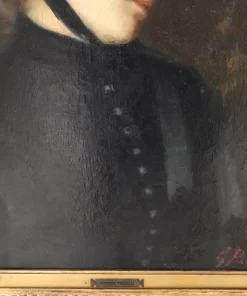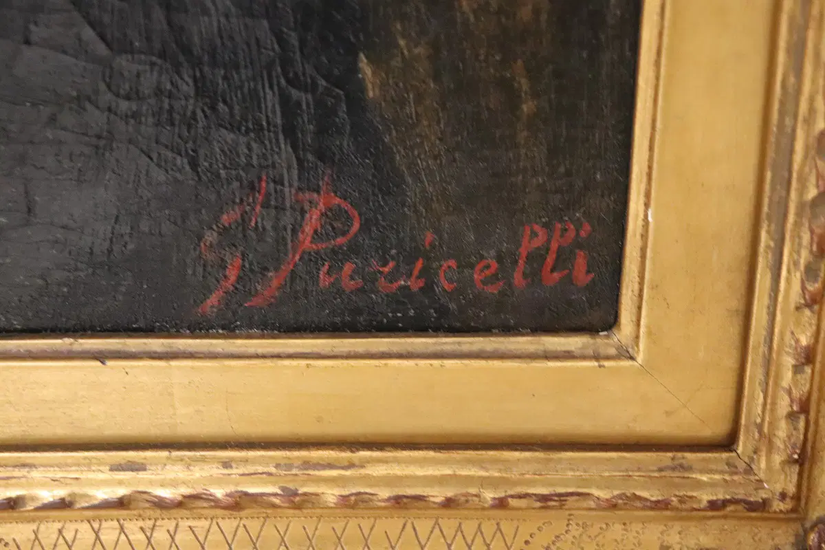 Questo squisito ritratto di giovane donna del XIX secolo offre uno sguardo affascinante sulla sensibilità artistica dell’epoca. Firmato in basso a destra in rosso da G. Puricelli, il dipinto è attribuibile al pittore italiano Giuseppe Puricelli, nato a Gallarate (Italia) il 4 settembre 1825 e morto a Casirate d’Adda (Italia) il 17 luglio 1894, come indicato dalla targa sulla cornice, dipinto privo di autentica. Il ritratto rappresenta una giovane donna vestita con abiti semplici ma eleganti, completata da un cappello nero alla moda, che incarna perfettamente lo stile dell’epoca. La scelta dell’artista di ritrarla di tre quarti, con la testa leggermente chinata e uno sguardo contemplativo, evoca un senso di mistero e introspezione che invita l’osservatore a cogliere la profondità del personaggio. L’influenza espressionista dell’opera è evidente, con forti sfumature emotive che elevano il ritratto oltre la mera rappresentazione fisica. La capacità dell’artista di trasmettere il mondo interiore del soggetto attraverso dettagli delicati e un abile gioco di luci e ombre testimonia la sua notevole abilità e visione artistica. Accompagnato da una splendida cornice in legno dorato, il ritratto è stato rintelato, garantendo la sua conservazione per le generazioni future. Questo pezzo costituirebbe un’importante aggiunta a qualsiasi collezione di ritratti di antichi maestri, offrendo un eccezionale esempio di ritrattistica del XIX secolo che risuona con emozione e maestria. Non lasciatevi sfuggire l’opportunità di possedere un’opera che parla non solo di bellezza, ma anche di un’epoca e di una sensibilità artistica senza tempo.
