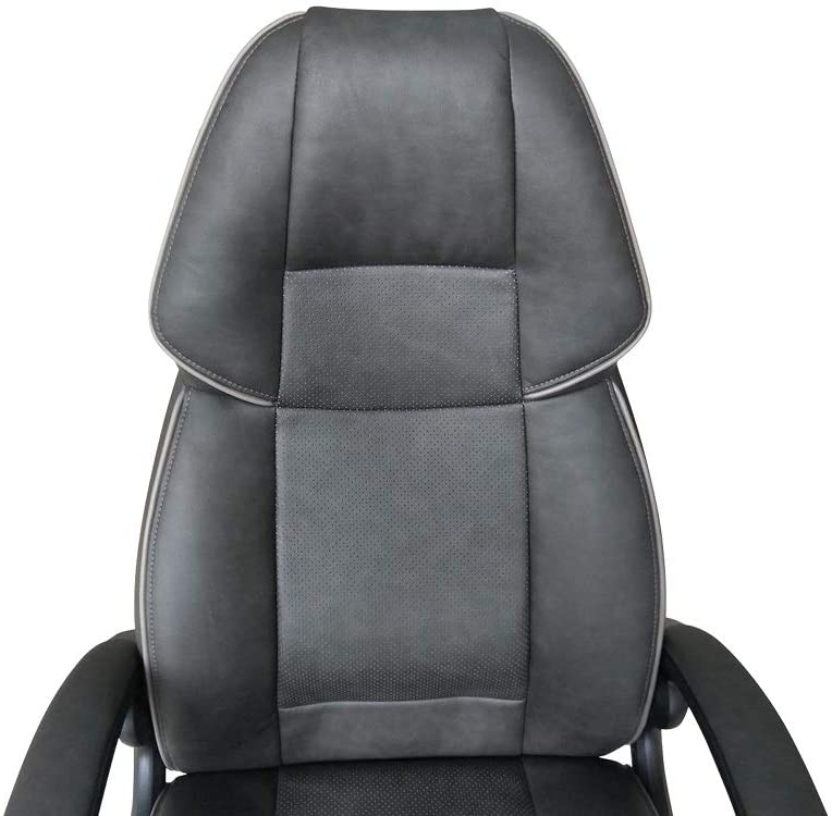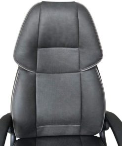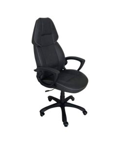Comoda poltrona da ufficio imbottita e rivestita in similpelle colore nero caratterizzata da un bordino grigio che delimita ogni parte. La poltrona direzionale Roland disegna forme accomodanti per ogni parte della schiena, assicurando una postura corretta e confortevole per lunghe ore.