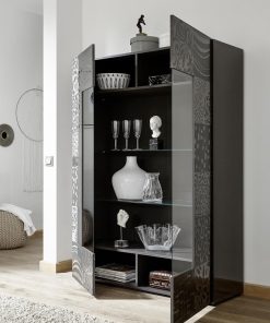 Vetrina moderna due ante Ruby, un modello che conquisterà coloro che cercano un arredo unico ed elegante. La vetrina Ruby, si distingue dal resto della categoria, per il frontale decorato con disegni serigrafati, con fantasie alternate e differenti. Disponibile in due colori con laccatura lucida, bianco per chi preferisce un ambiente raffinato e luminoso, oppure grigio lucido per un effetto impattante e chic.