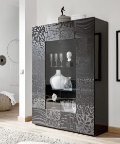 Vetrina moderna due ante Ruby, un modello che conquisterà coloro che cercano un arredo unico ed elegante. La vetrina Ruby, si distingue dal resto della categoria, per il frontale decorato con disegni serigrafati, con fantasie alternate e differenti. Disponibile in due colori con laccatura lucida, bianco per chi preferisce un ambiente raffinato e luminoso, oppure grigio lucido per un effetto impattante e chic.