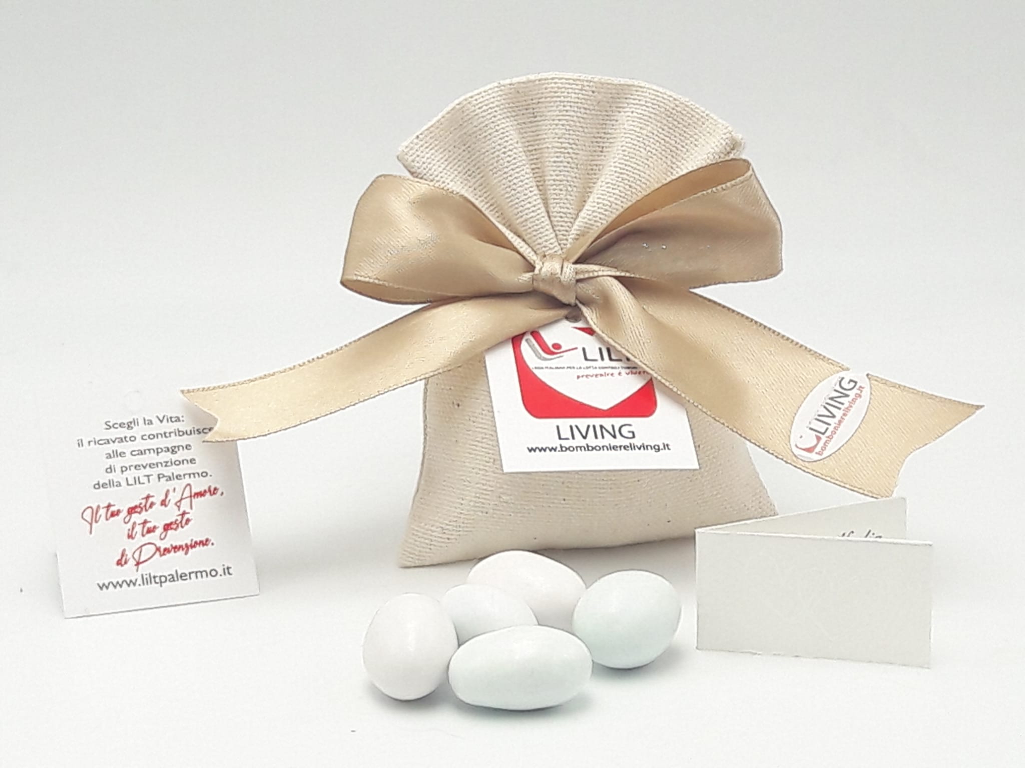 Bomboniera Solidale sacchetto portaconfetti di lino grezzo chiaro della linea solidale LILT-Living, confezionata con possibilità di scegliere colore e gusto dei confetti.