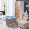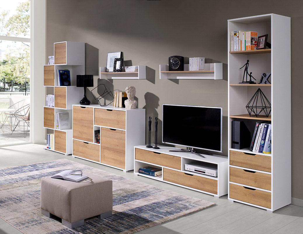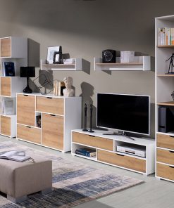 Salotto completo Salina, comprendente ben 6 elementi: un mobile basso porta tv, una credenza con ante e cassetti, una libreria a colonna con cassetti e ripiani, una libreria asimmetrica con vani aperti e 5 vani chiusi e infine, 2 mensole. Tutto realizzato in legno bianco opaco contrastato da frontali colore naturale, una soluzione estetica sobria, moderna e che viene incontro a gusti diversi.