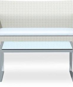 Salotto da esterno composto da 1 tavolo, 1 divano e 2 poltrone realizzate in metallo. Il set si presenta con un look moderno ed elegante con la disponibilità di una colorazione bianca o nera. Poltrone e divano comprendono un morbido cuscino bianco che assicura comfort e comodità.