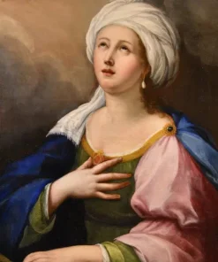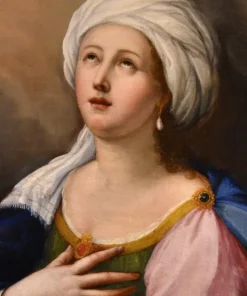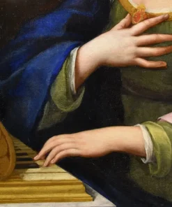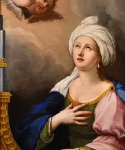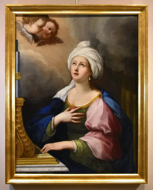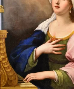 Questo suggestivo dipinto, che siamo lieti di esporvi, vede al centro della composizione Santa Cecilia, la nobildonna romana poi convertita al cristianesimo e personaggio molto apprezzato nel periodo barocco, poiché patrona della musica, degli strumentisti e dei cantanti; è qui raffigurata come una splendida fanciulla vestita con abiti regali, intenta a suonare uno strumento musicale vegliata da angeliche presenze.