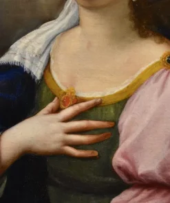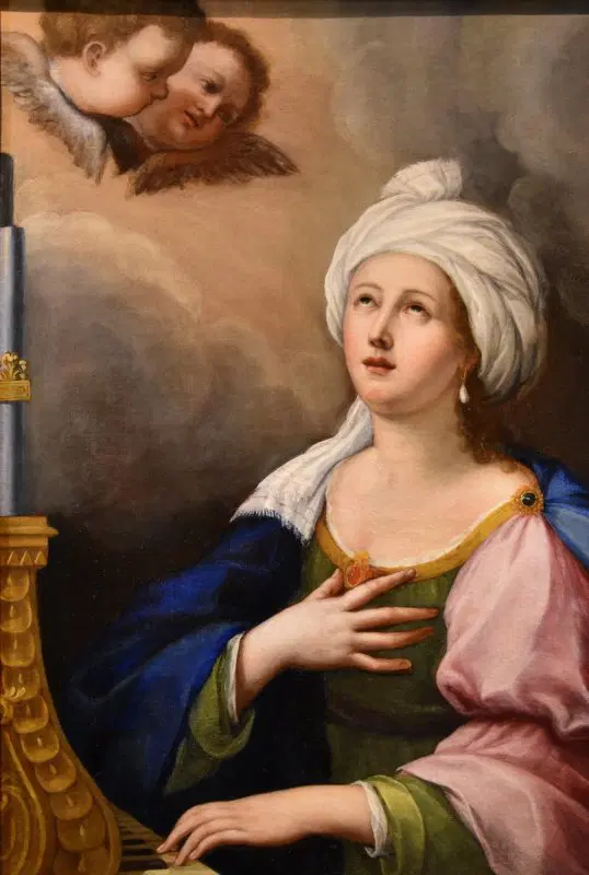 Bellissimo ed evocativo è il dettaglio del suo sguardo rivolto verso l’alto, irradiato da una luce mistica e divina, poiché è proprio attraverso la musica che la Santa si eleva verso il divino.