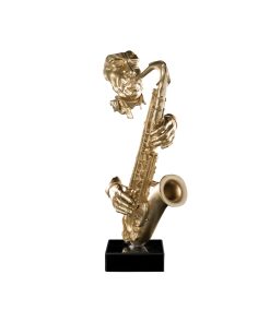 Scultura in poliresina raffigurante un sassofonista che si accinge a suonare il suo strumento preferito. La composizione viene assemblata con una base in marmo nero ed una struttura che può assumere una colorazione dorata oppure bianca. Entrambe le varianti richiamano lo stile moderno e si possono collocare ovunque con facilità creando anche fantasiose composizioni con altri generi di arredamento.