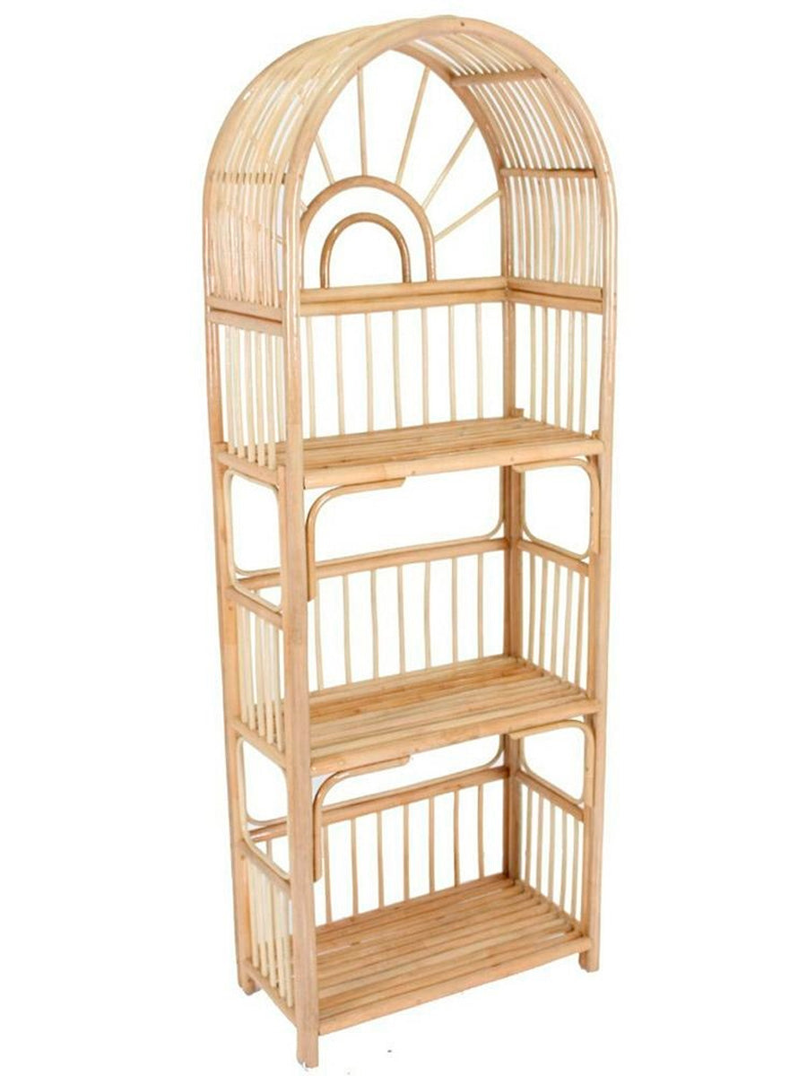 Originale scaffale libreria da interno, realizzato interamente in rattan, colore naturale. La struttura dispone di 3 ripiani su cui riporre libri, riviste, piantine o altra oggettistica di vostro uso e piacimento. Particolare la sua forma, con un arco nella parte superiore, caratteristica che dona unicità a questa libreria. Perfetta da collocare in camera, in salotto o soggiorno per un complemento d’arredo innovativo.