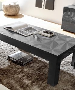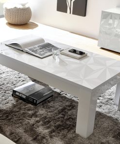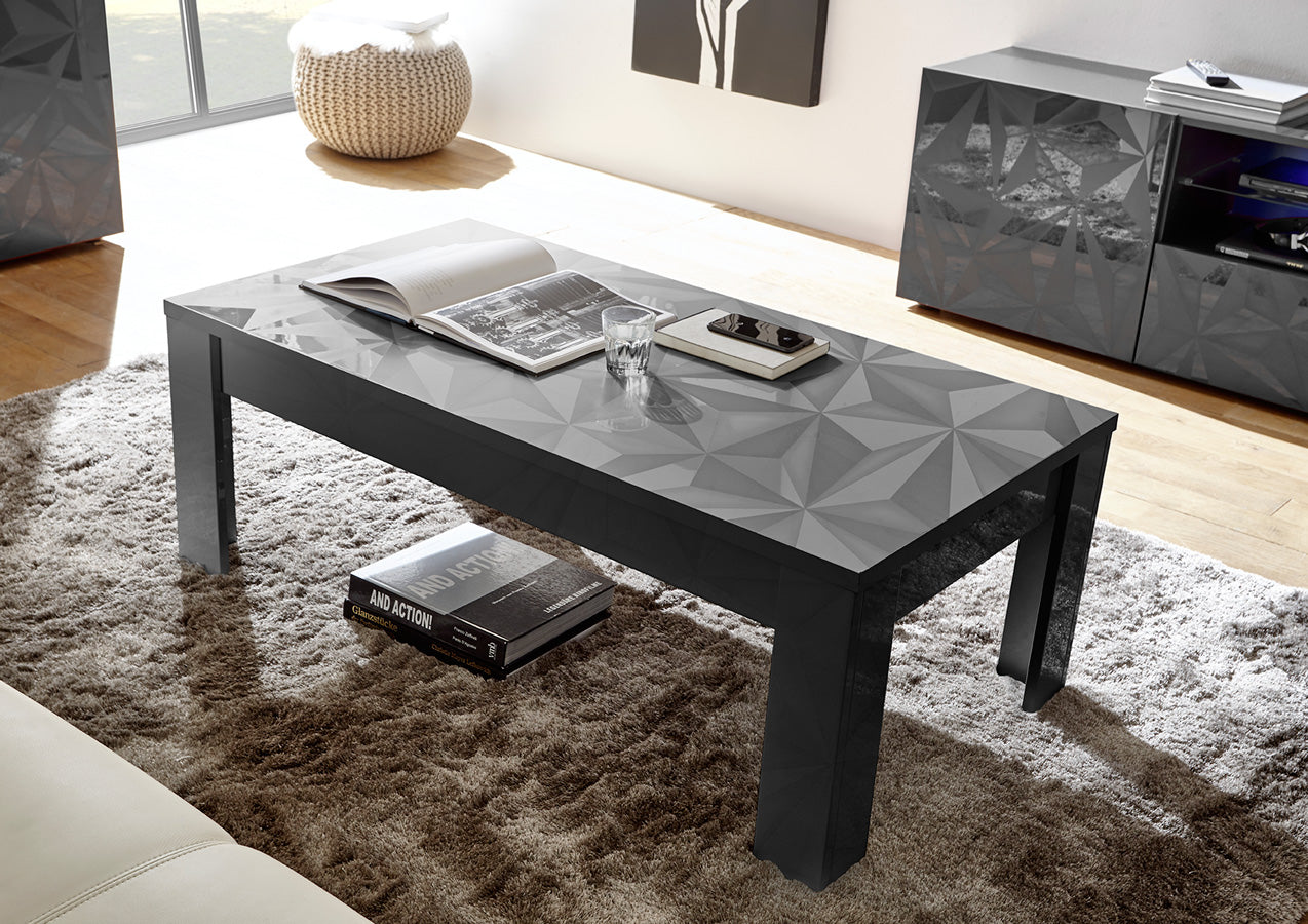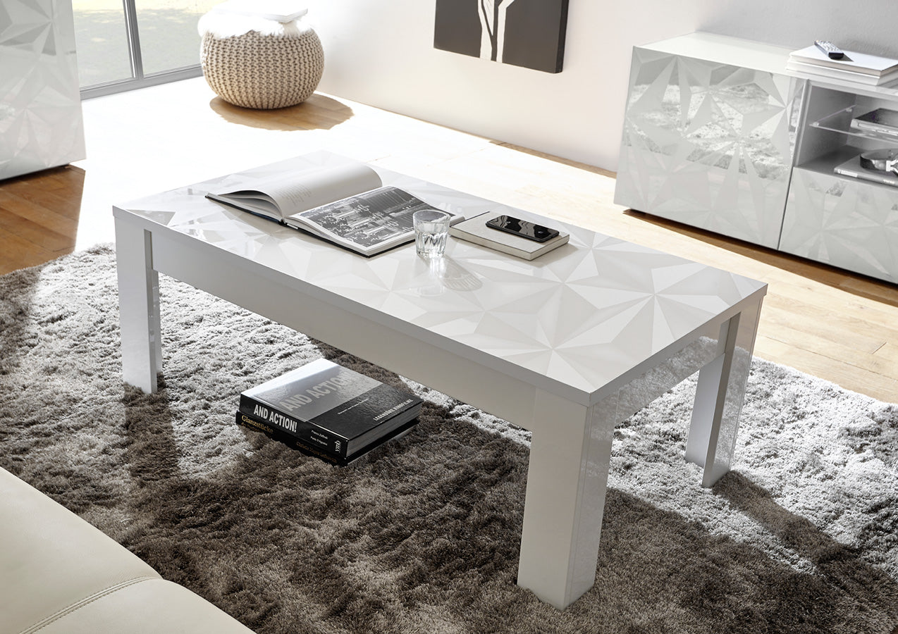 Ampio tavolino basso per salotto realizzato in legno nelle finiture bianco o grigio lucido laccato, stupendo grazie al piano serigrafato con texture poligonale in 3D.