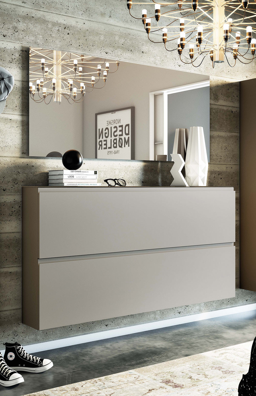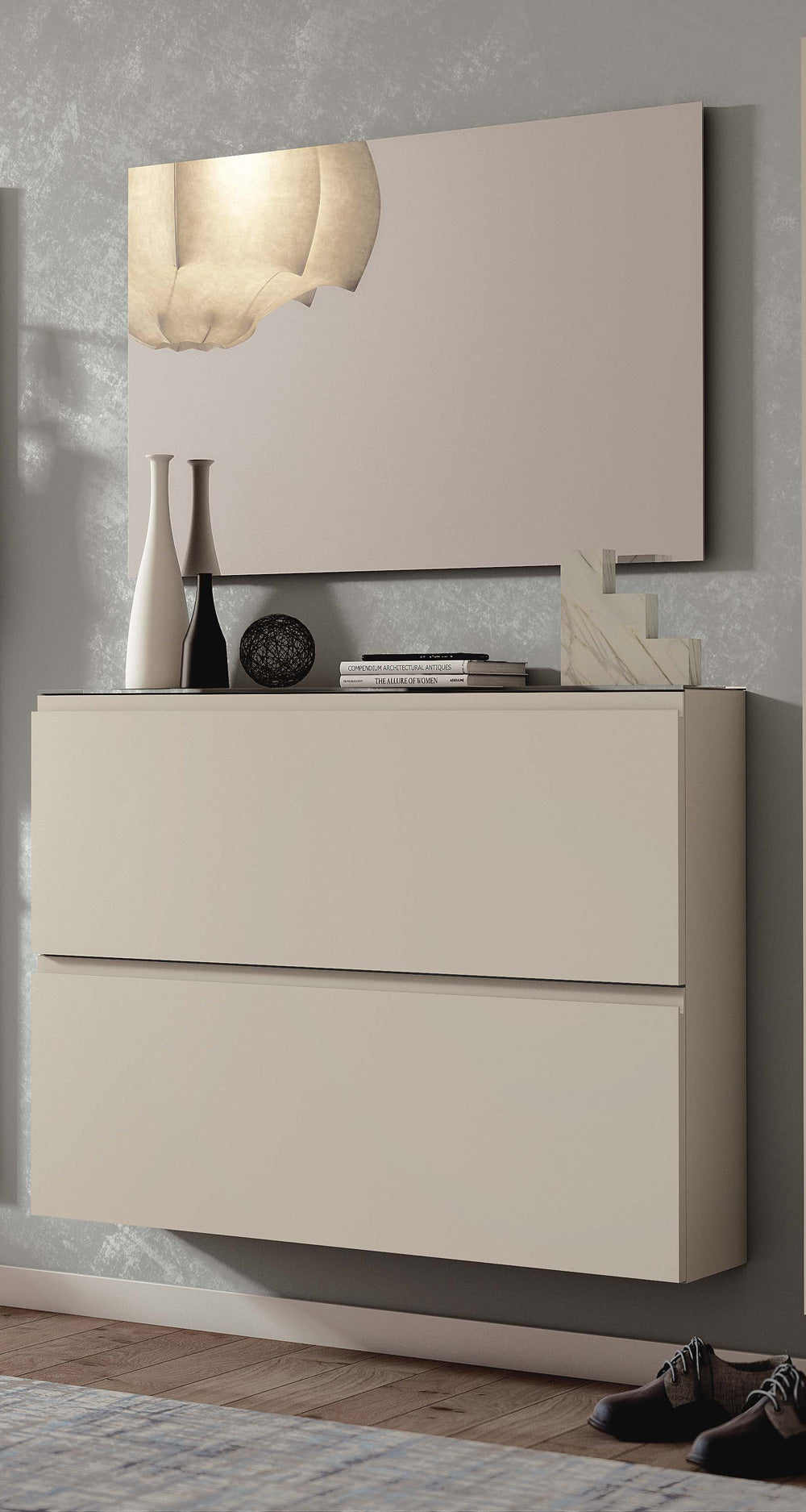 Scarpiera sospesa moderna, un modello apprezzato per l’essenzialità del design italiano, composta da 2 cassetti. Realizzato in legno con top in vetro, il portascarpe è disponibile in due misure: da cm 110 o cm 160, e in 3 colori neutri, come bianco, sabbia o tortora.