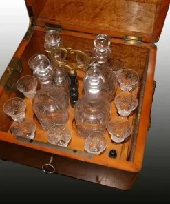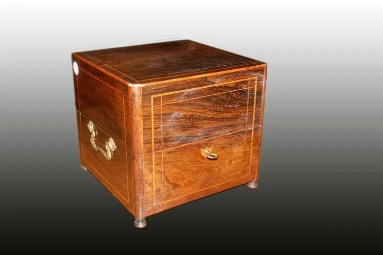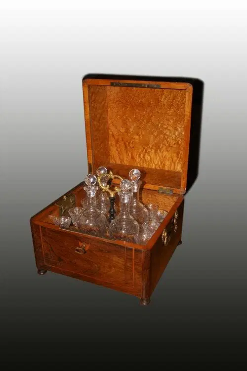 Scatola porta liquori francese della prima metà del 1800, stile Carlo X, in legno di palissandro. Presenta filetto di intarsio sulla superficie esterna mentre internamente è dotata di un set di bicchierini e bottiglie antichi con struttura in ottone.