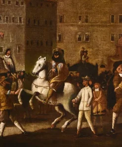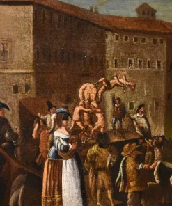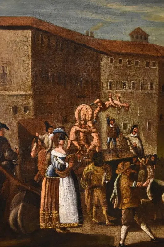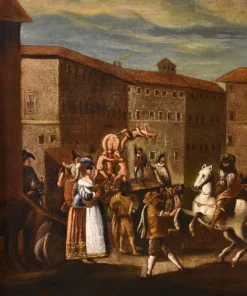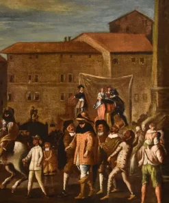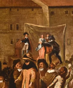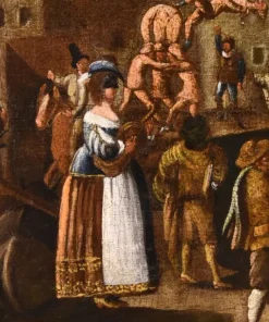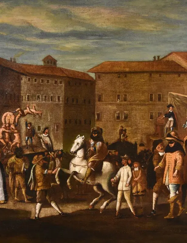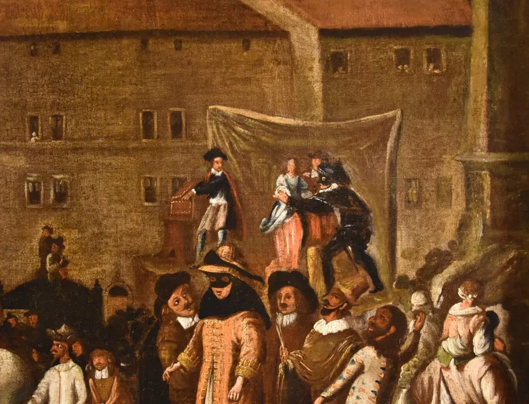 Nel contesto di una grande piazza gremita di personaggi in maschera e costume, il dipinto raffigura una scena di giubilo durante i festeggiamenti del Carnevale a Roma nel XVII secolo, e risulta pertanto essere una testimonianza molto interessante delle usanze dell’epoca.