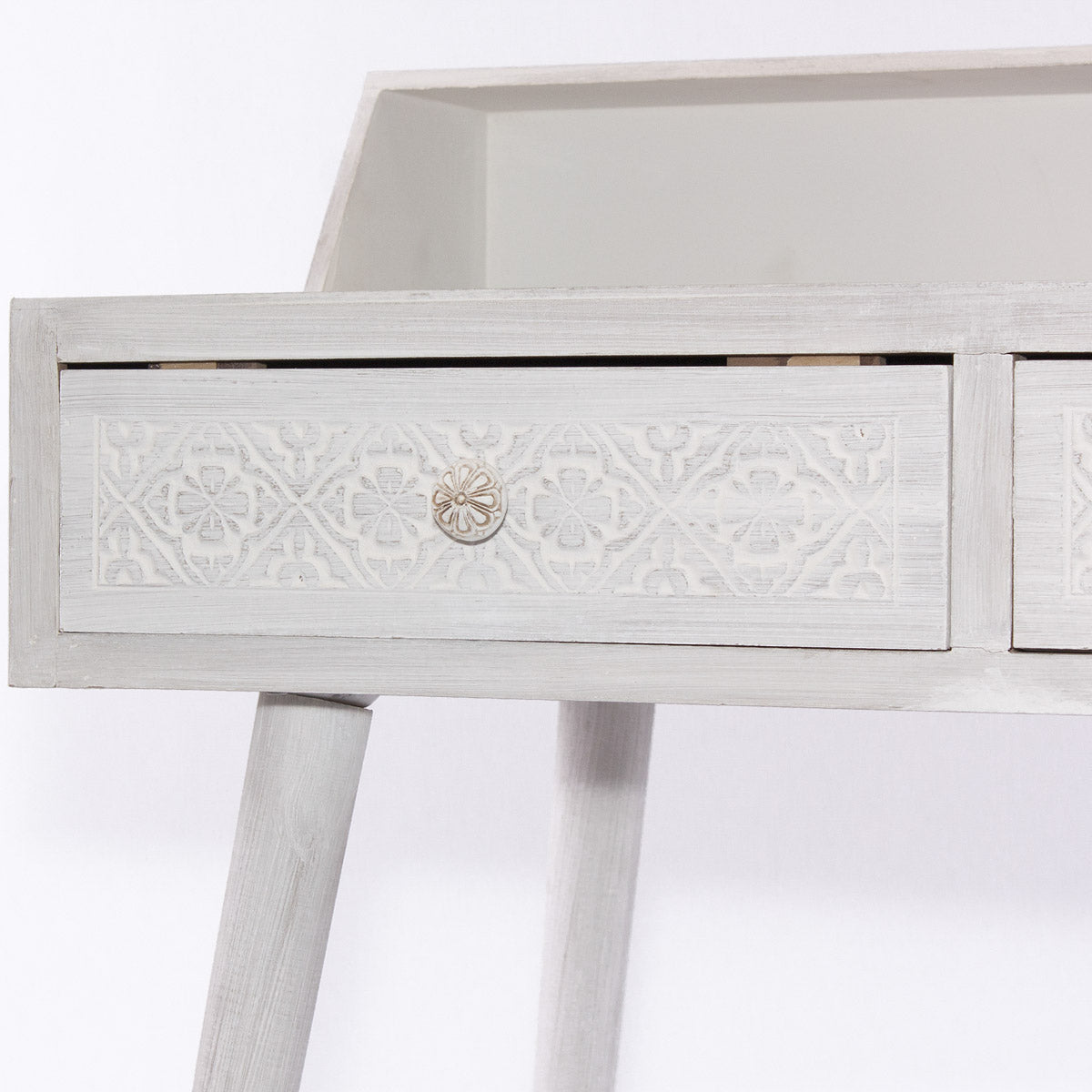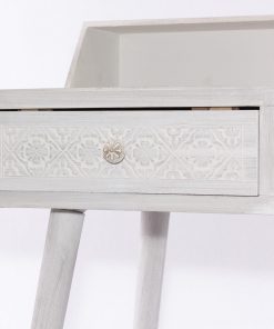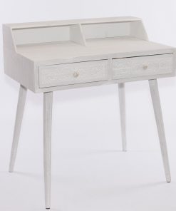 Scrittoio in legno di pino, colore bianco, con 2 cassetti porta gioie, dotati di pomelli per l’apertura, e decorati sui frontali. Semplice ma elegante, nel suo stile classico, la scrivania donerà un tocco di originalità alla vostra camera o studio, perfetta da collocare in qualsiasi tipo di ambiente. Una novità classica da non perdere, per un arredamento lineare e innovativo.