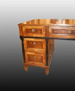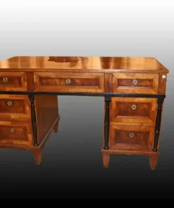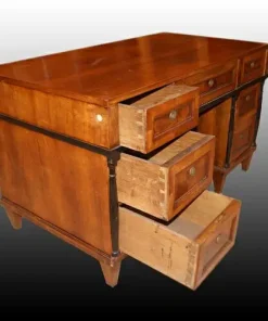 Bellissima scrivania italiana della prima metà 1800, stile Impero, in legno di noce. Presenta profili e colonnine ebanizzate, 7 cassetti e piedini a piramide rovesciata.
