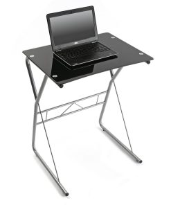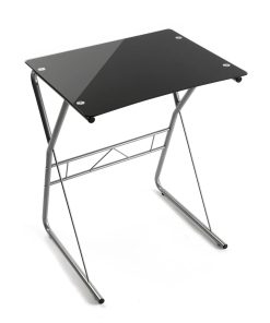 Pratica e raffinata scrivania porta pc, composta da struttura in metallo con piano in vetro, un modello adatto per chi ha bisogno di un piano da lavoro da inserire in piccoli ambienti, sia per la casa che per l’ufficio.
