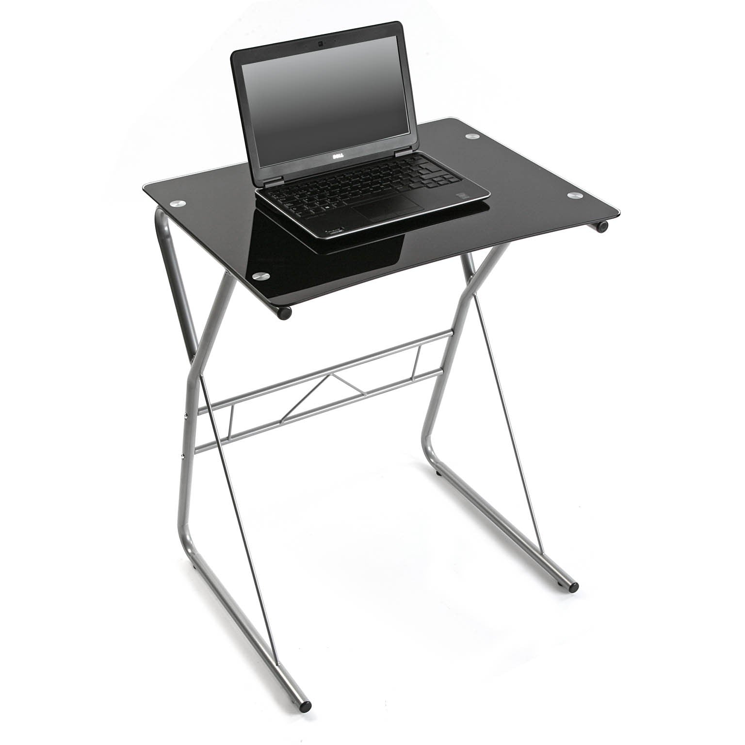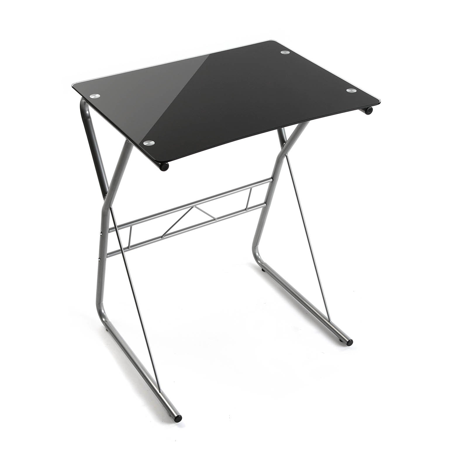 Scrivania porta pc dalle piccole dimensioni, caratterizzata dal piano realizzato in vetro, supportato da una semplice struttura in metallo.