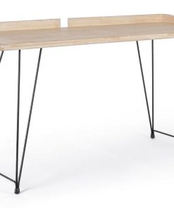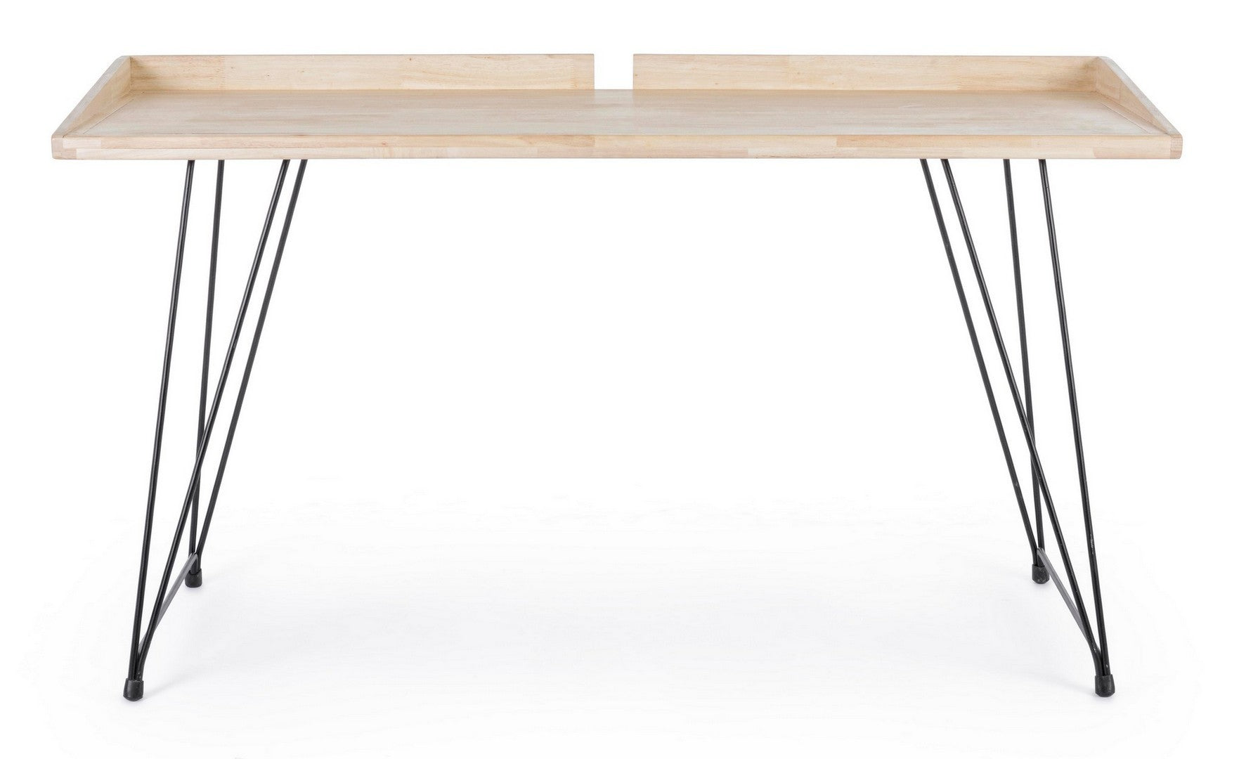 Scrivania moderna con piano ampio cm 142 e profondo 61 cm, composta da gambe a due sostegni in acciaio colore nero dalla linea volutamente essenziale. il piano abbinato è prodotto in legno colore naturale con bordo perimetrale alto.