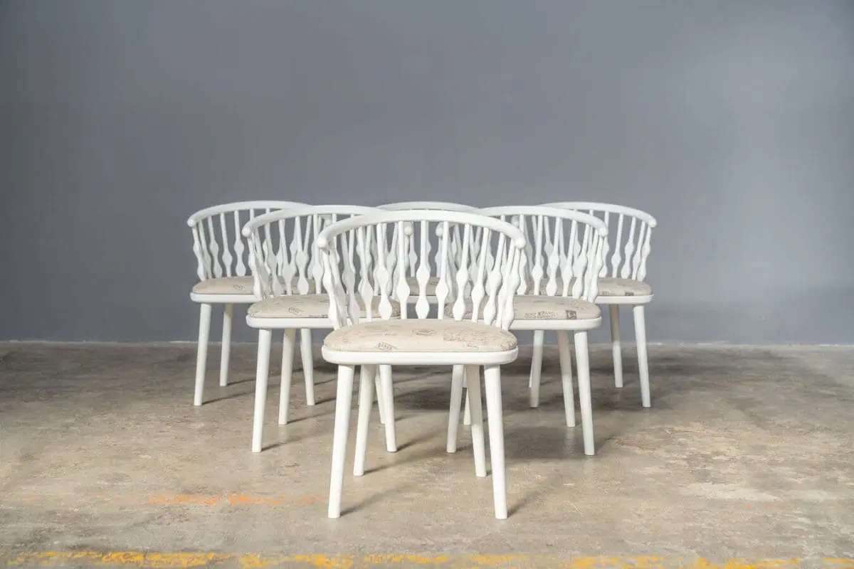 Sedia in faggio verniciata bianco opaco con sedile imbottito con tessuto 1970
