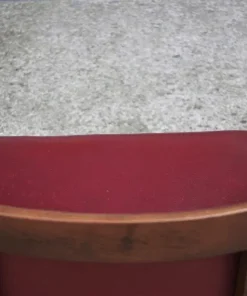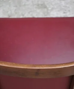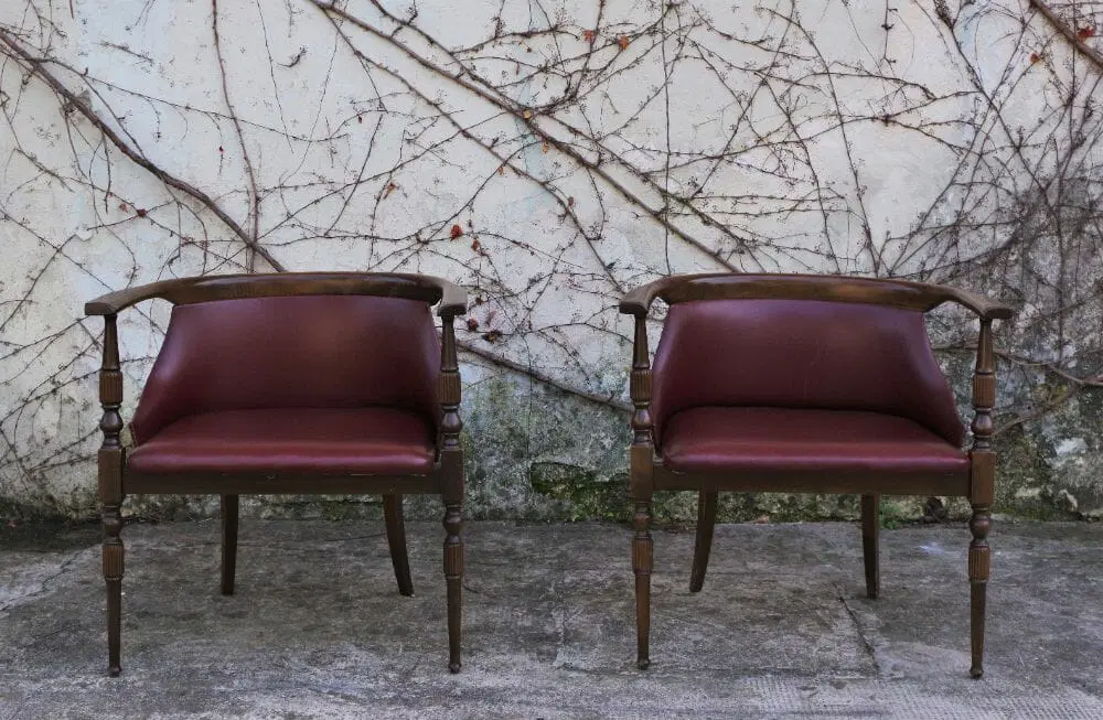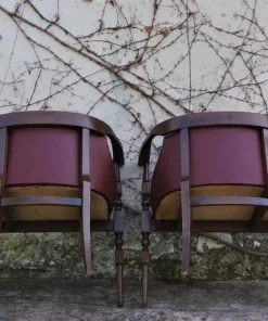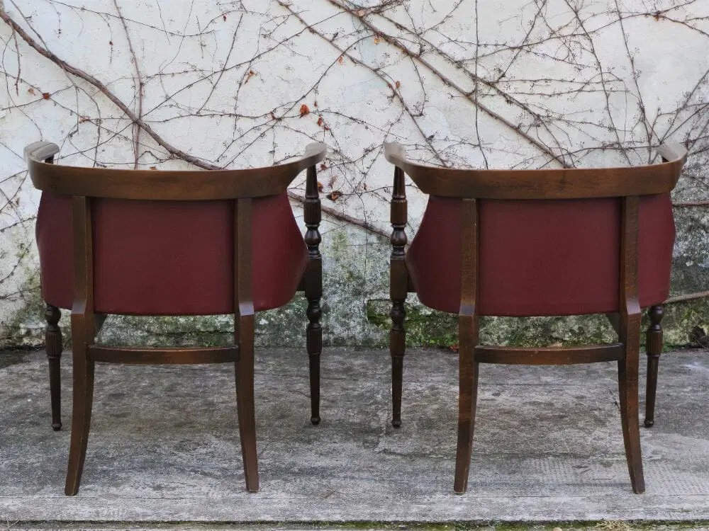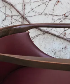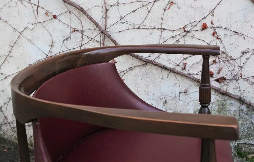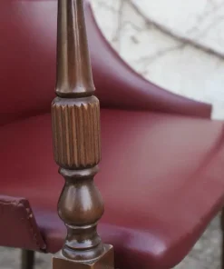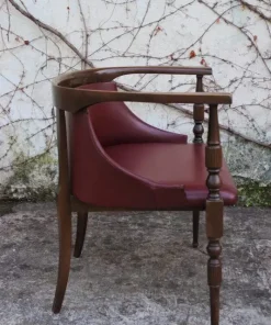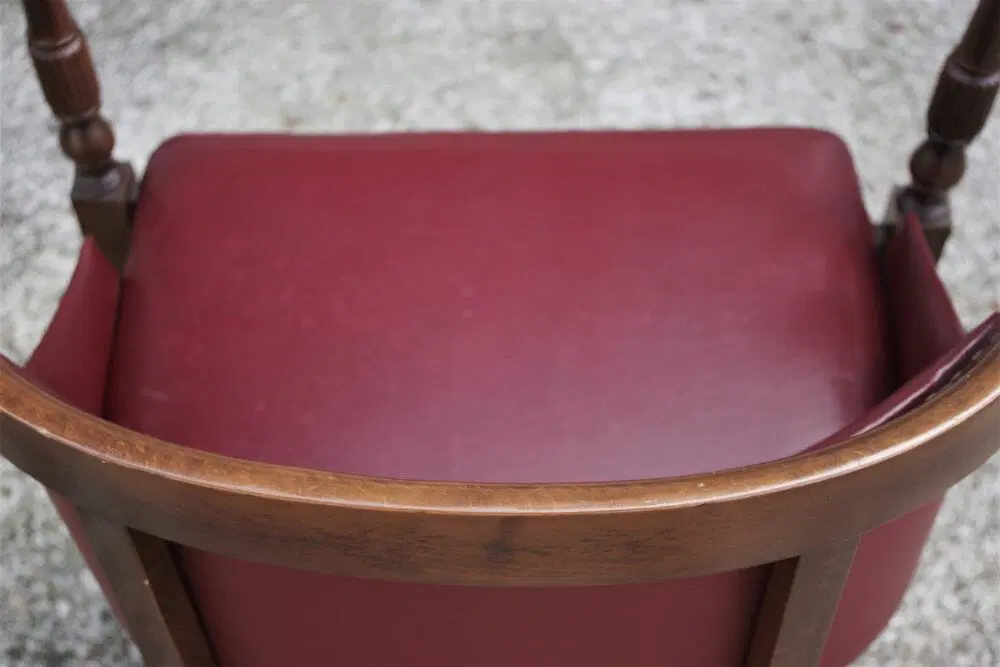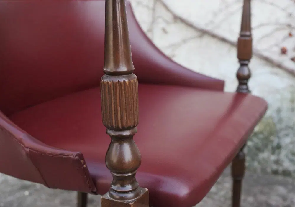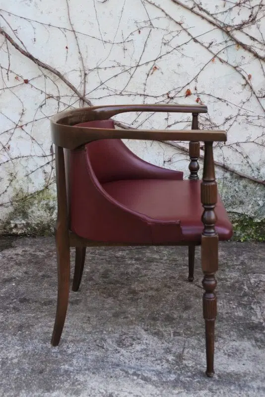 Due poltroncine da camera in legno con sedile e schienale in finta pelle bordeaux e gambe tornite anni ‘50