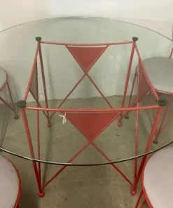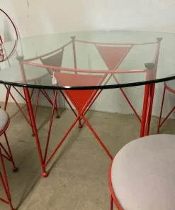 Design Unico – Gruppo quattro sedie struttura in metallo laccato rosso e tavolo con piano in cristallo , alto design anni 80 . designer Frank Lioyd Wright per Cassina . Pezzi Unici . Gli oggetti si trovano in ottimo stato di conservazione e sono tutti pezzi originali firmati . Mis Tavolo diametro cm 120 altezza cm 69 . Sedia altezza schiena cm 89 . Altezza seduta cm 44. Seduta diametro cm 40