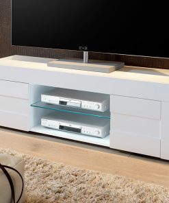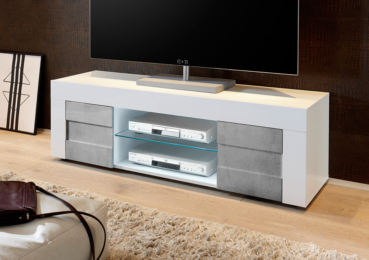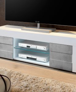 Mobile porta tv basso con 2 ante e vano centrale con mensola in vetro, una soluzione versatile grazie alla modernità e semplicità delle forme. Il mobile tv è realizzato interamente in legno bianco lucido, oppure è possibile scegliere una variante con struttura bianco lucido e ante colore cemento.