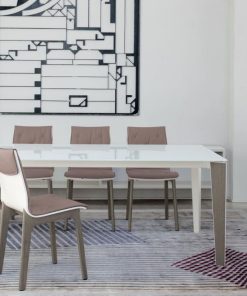 Il tavolo da soggiorno Senso conquista per la possibilità di creare il tavolo della finitura desiderata sia per il piano che per le gambe. Infatti, alla struttura in acciaio laccato è possibile applicare degli inserti della stessa finitura del piano o diversa, secondo il proprio gusto.
