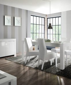 Sesana è un’idea già composta per il soggiorno con madia 4 ante, credenza alta e tavolo da cm 137 allungabile a cm 185, progettata per diventare una soluzione versatile, moderna ad un prezzo agevolato. La nostra sala pranzo è definita da mobili dal design sobrio e pulito con finitura laccata lucida e privi di maniglie, prodotti 100% Made in Italy.