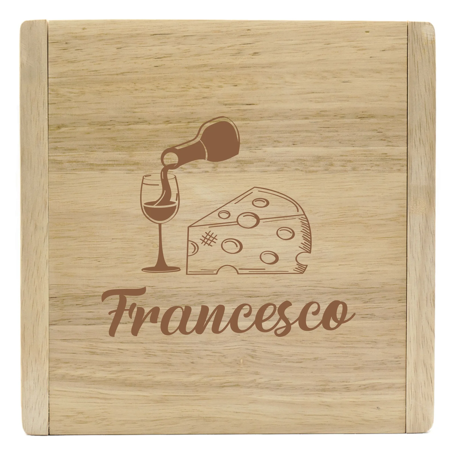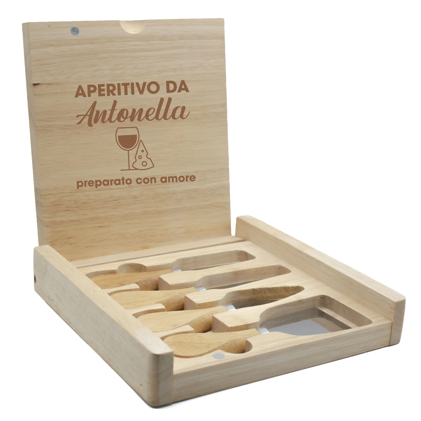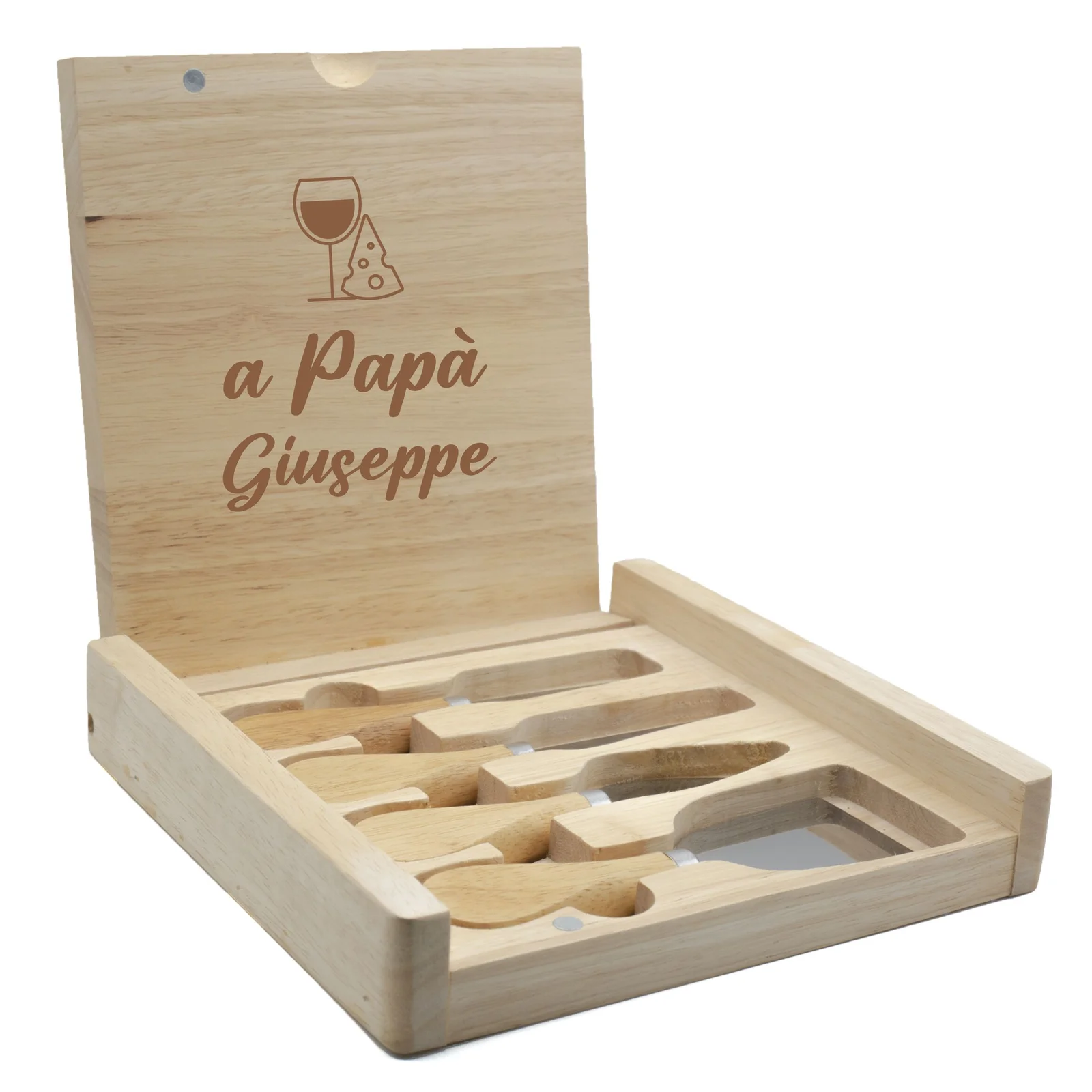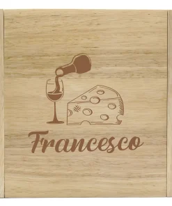 Set Coltelli Formaggio Tagliere Personalizzabile Salumi Incisione Personalizzata: simpatica e originale Idea Regalo. Cofanetto contenente 3 coltelli e 1 forchetta, ideali per formaggi e salumi. Dimensioni chiuso 22,5×22,5 cm, dimensioni aperto 43,5×22,5 cm. Legno di alta qualità.