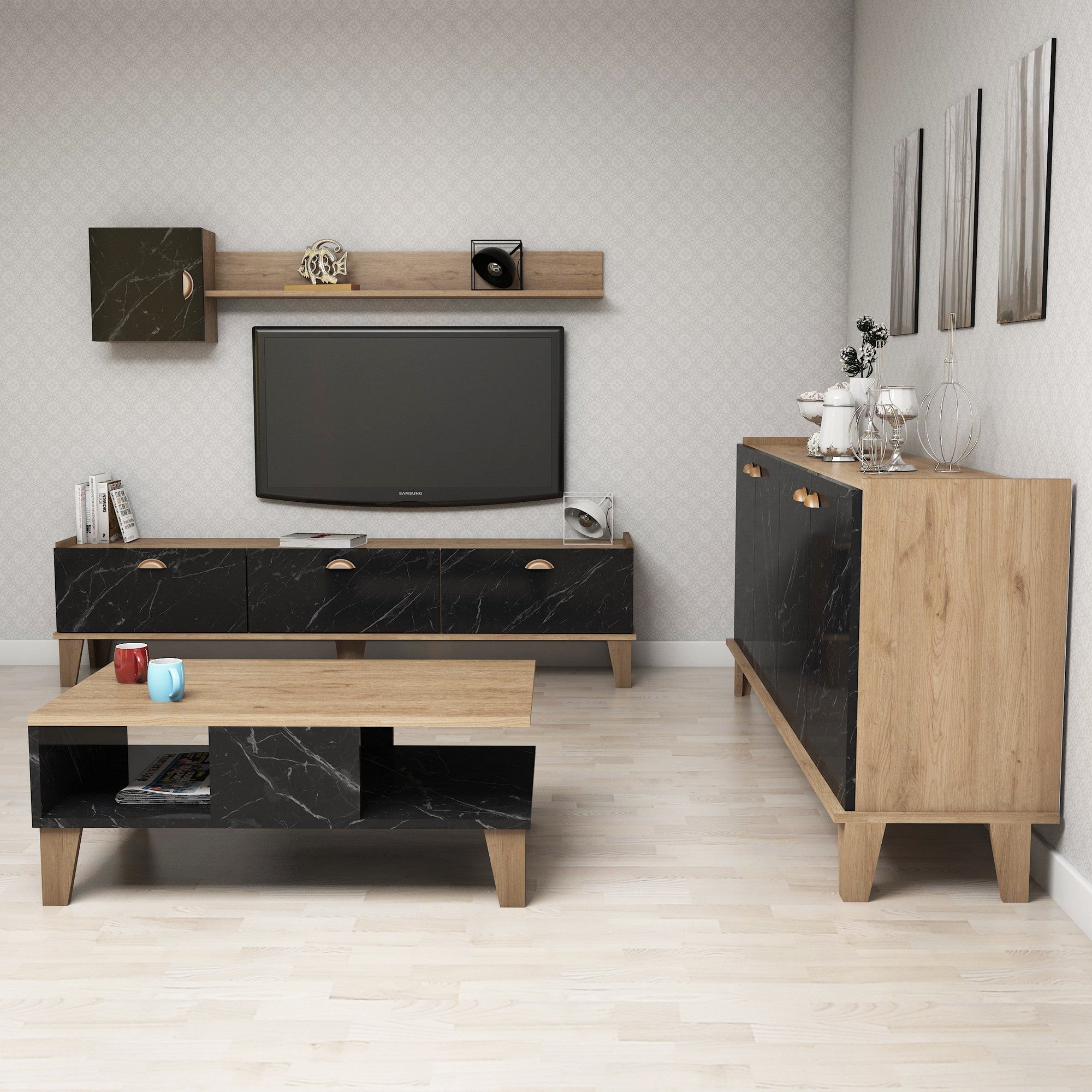 Elegante, raffinato e pieno di bellissimi dettagli: sì, stiamo parlando del nostro soggiorno completo! Dotato di una mensola, un mobile tv, una madia e un tavolino basso.