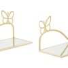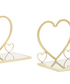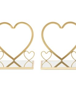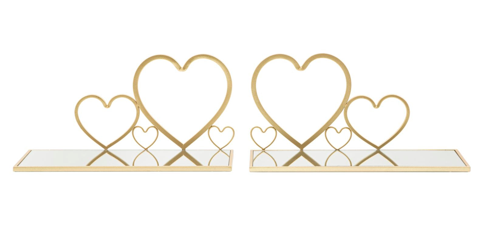Coppia di comodini realizzati in metallo colore oro, un’alternativa salvaspazio al classico comodino da camera. Infatti questo delicato modello si presenta come una semplice mensola arricchita da ripiano con specchio e decorata con romantici cuori, ideale per esaltare un arredamento elegante e raffinato. Ovviamente nulla vita di utilizzare il set come semplice mensole per ornare l’ingresso o altre stanze della casa.