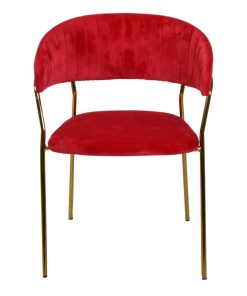 Poltroncina design resa elegante non solo per la struttura in metallo colore oro, ma anche per il rivestimento in velluto lavorato con cuciture verticali sullo schienale, colore rosso.