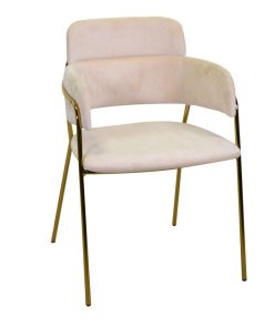 Poltroncina dalle linee moderne ottima per accompagnare un tavolo design, una scrivania elegante o semplicemente diventare un elemento d’arredo sofisticato e glamour. Questa sedia moderna infatti, presenta una raffinata struttura in metallo colore oro, rivestita in tessuto effetto velluto colore crema, si caratterizza inoltre, per la forma a semicerchio, avvolgente e comoda.