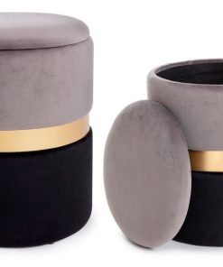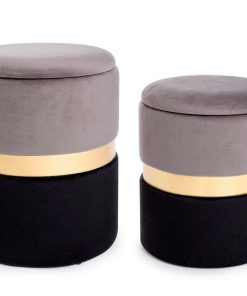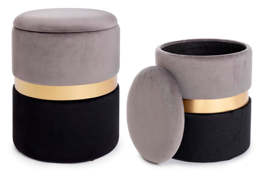 Set da 2 pouf contenitore in velluto, a scelta tra il colore rosa e rosso, grigio e nero, con anello centrale dorato, e rosa e grigio con anello centrale argento. In stile moderno, per arredare la propria casa con eleganza.