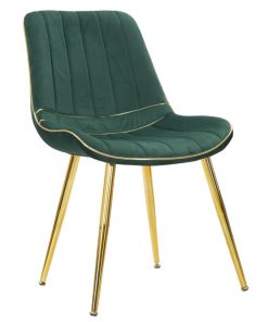 Sedia dal design moderno ed elegante grazie ai materiali che la compongono. Infatti, le gambe sono realizzate in metallo dorato mentre la seduta è rivestita in velluto con inserti dorati che hanno lo scopo di aggiungere eleganza e produrre una seduta per ambienti glamour e trendy.