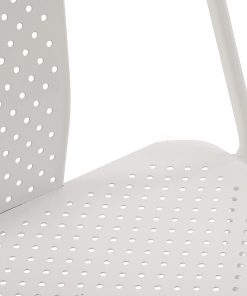 Set da 2 sgabelli in metallo di colore bianco. Lo stile moderno si denota dall’uso monocromatico del bianco e la ricerca di linearità nelle forme. Completa la decorazione la presenza di fori su schienale e seduta.
