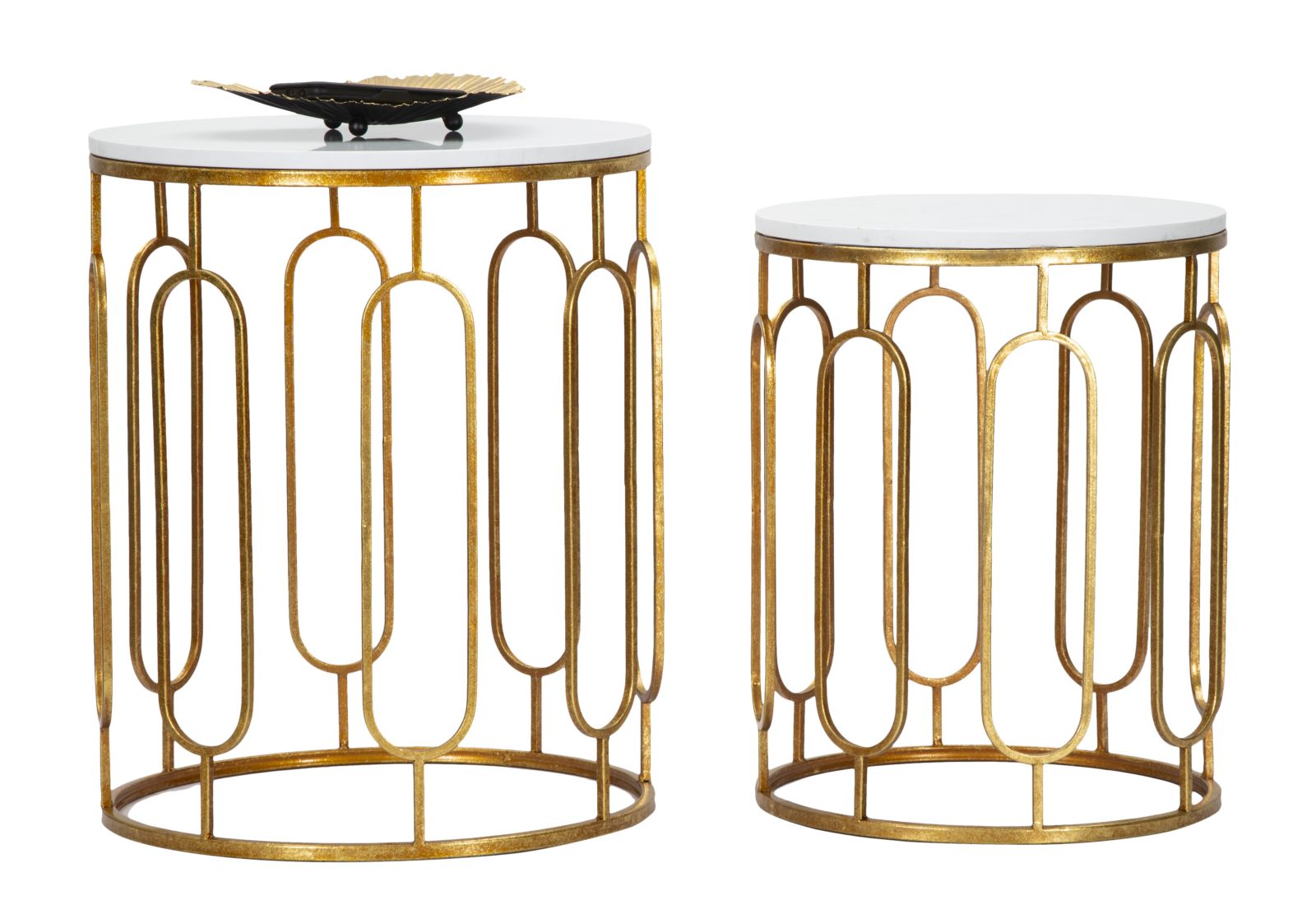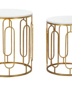 Coppia di 2 tavolini da salotto di forma tonda resi eleganti grazie alla base lavorata in metallo colore oro con piano in resina effetto marmo.