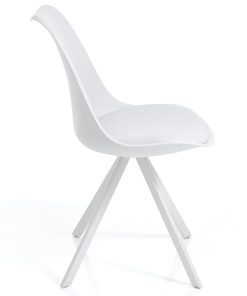 Sedia design con comoda scocca in polipropilene accompagnata da cuscino in similpelle e gambe in acciaio. La sedia è disponibile i 3 colori classici come bianco, grigio o nero.