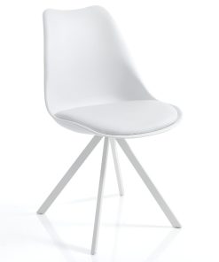 Sedia design con comoda scocca in polipropilene accompagnata da cuscino in similpelle e gambe in acciaio. La sedia è disponibile i 3 colori classici come bianco, grigio o nero.