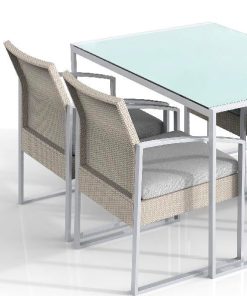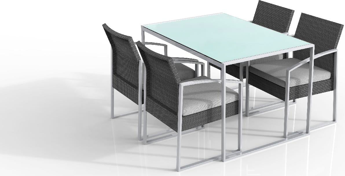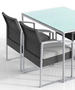 Set da pranzo formato da un tavolo con struttura in metallo e top in vetro e 4 poltrone in metallo con rivestimento colore nero e cuscino ad alto comfort di colore grigio. La composizione è adatta sia ad un ambiente esterno sia ad uno interno e mostra la sua eleganza attraverso l’uso di elementi semplici di uno stile moderno. Il set si presenta con la possibilità di scegliere tra un colore nero ed un colore bianco.