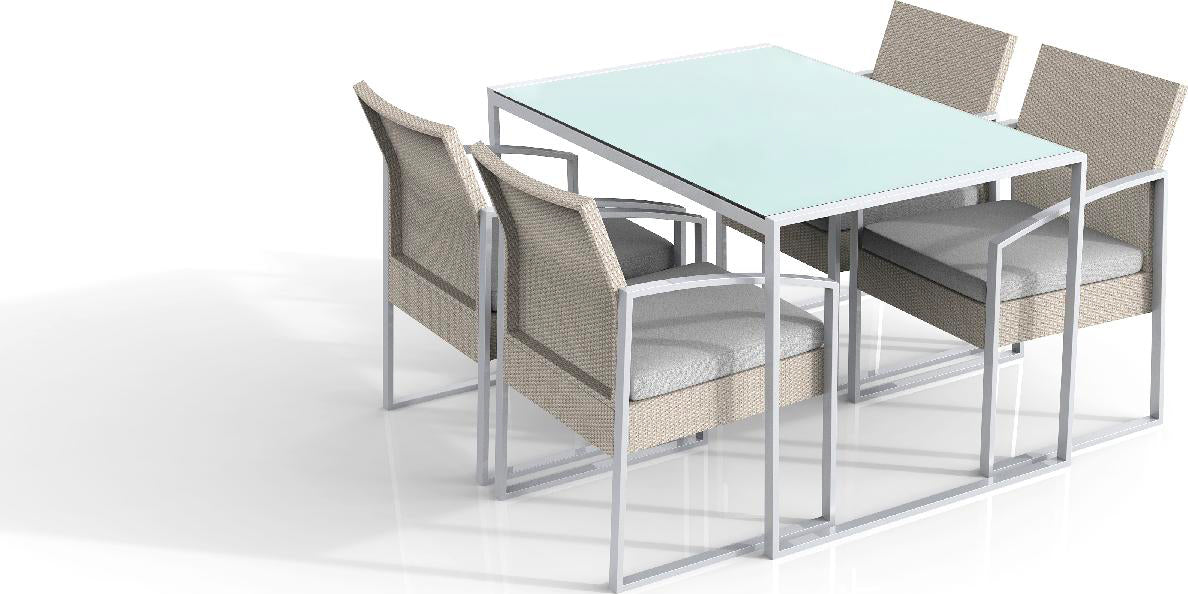 Set da esterno composto da tavolo in vetro e metallo e 4 poltrone. Le poltrone sono dotate di cuscini ad alta comodità che rendono al quanto elegante l’intera composizione, creata secondo caratteri di uno stile moderno. Disponibile la scelta tra una coloraziona nera o bianca.
