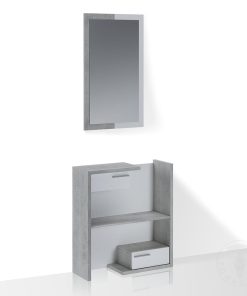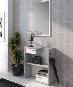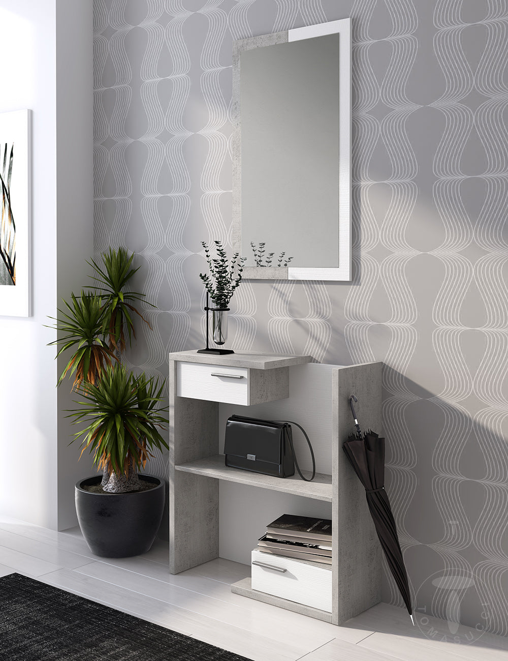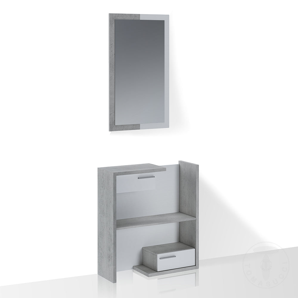 Set da ingresso composto da mobile e specchio, un articolo interessante e funzionale realizzato in legno in cui vengono abbinate due finiture: larice a poro aperto e cemento. Il mobiletto inferiore è strutturato con 2 piccoli cassetti e un ripiano centrale, mentre lo specchio rettangolare presenta la cornice in cui si incontrano in maniera simmetrica questi due colori contrastanti.