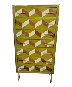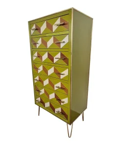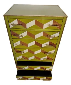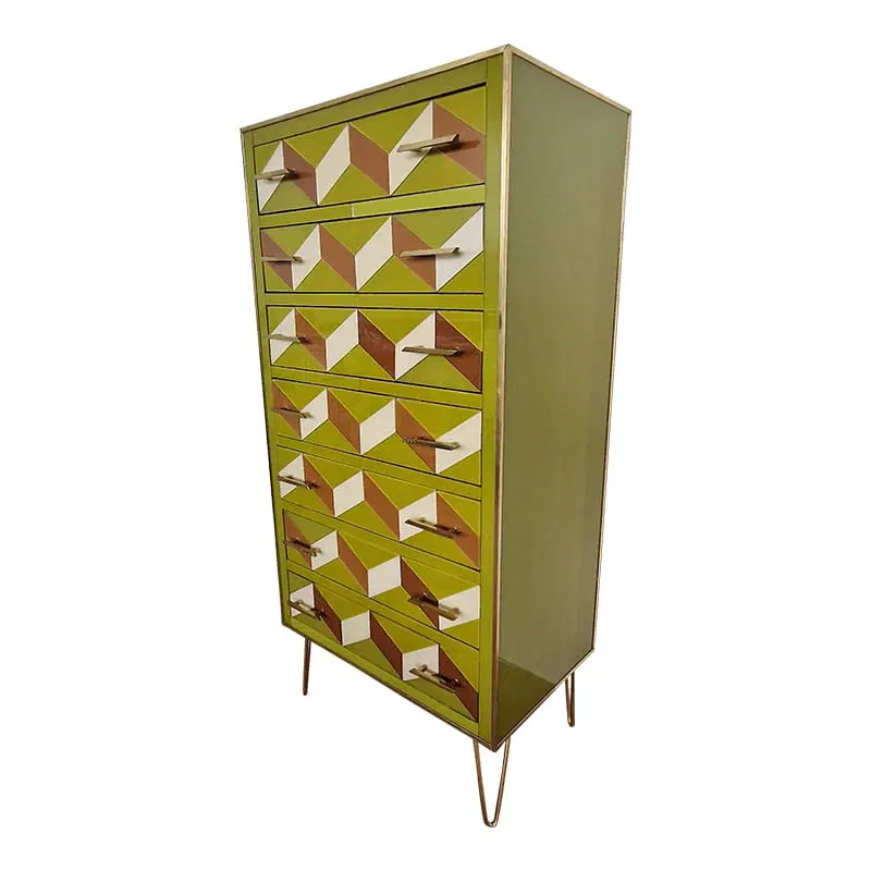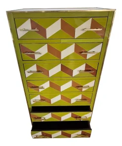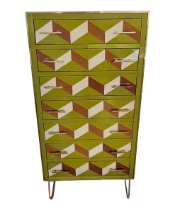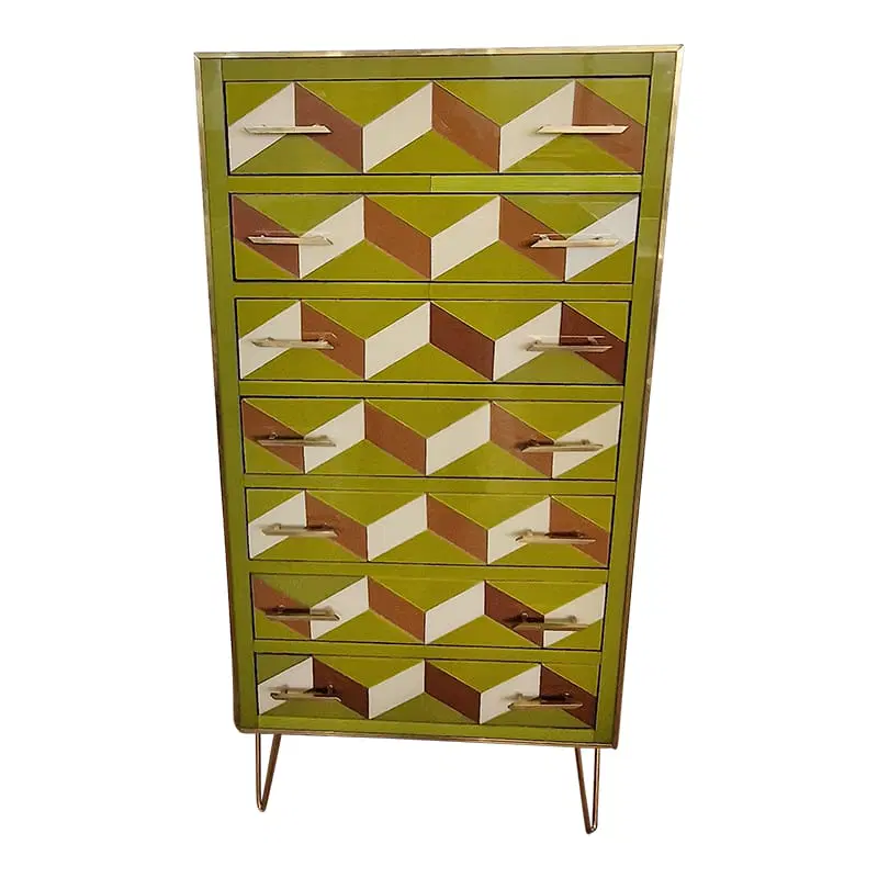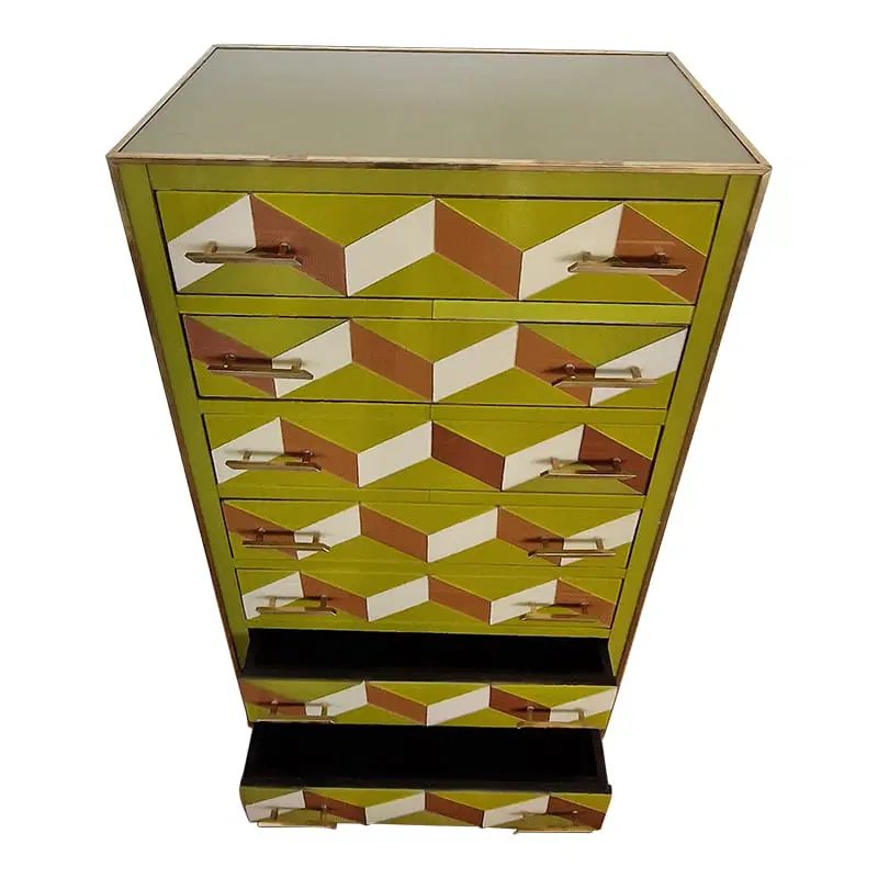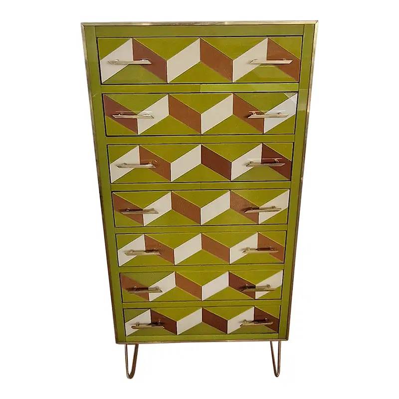 Settimanale interamente realizzato a mano, con struttura in legno rivestita in vetro verde con effetti geometrici marroni e bianco; profili, maniglie e piedi in ottone dorato.