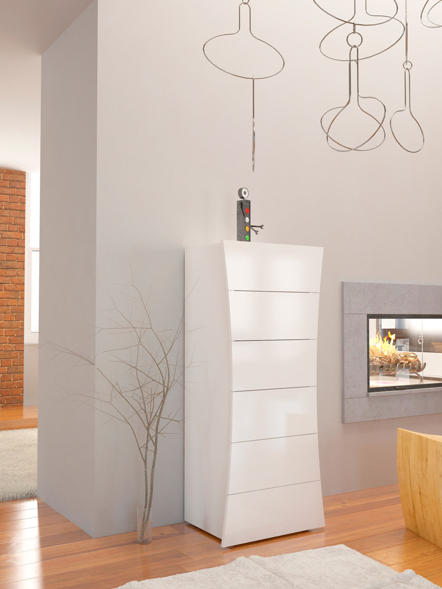 Cassettiera in legno, colore bianco lucido,6 cassetti. Perfetta da collocare in camera, soggiorno o salotto, questa cassettiera è il giusto complemento per chi desidera un design moderno e unico, che doni eleganza alla stanza. Con i suoi bordi ad arco, la cassettiera darà il giusto look stiloso e innovativo.