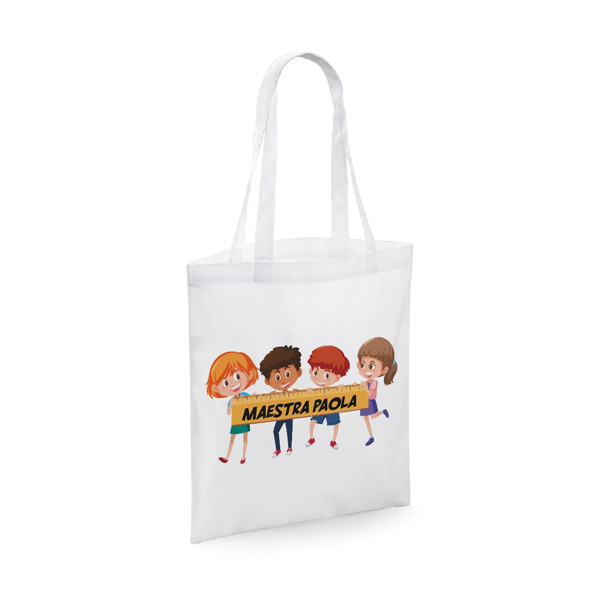 Shopping Bag in cotone Maestra Personalizzabile con nome della maestra – bambini felici – idea regalo fine anno scolatisco