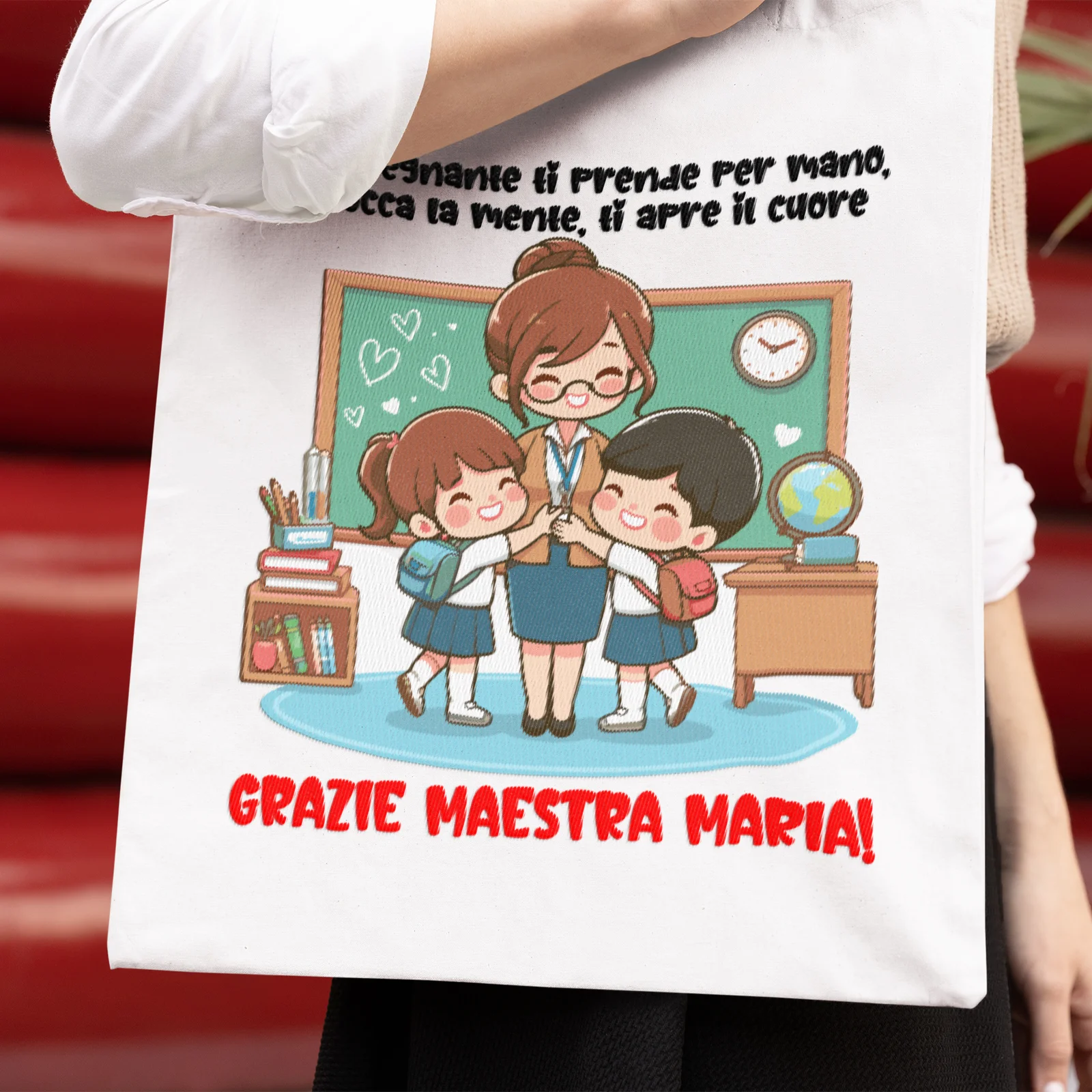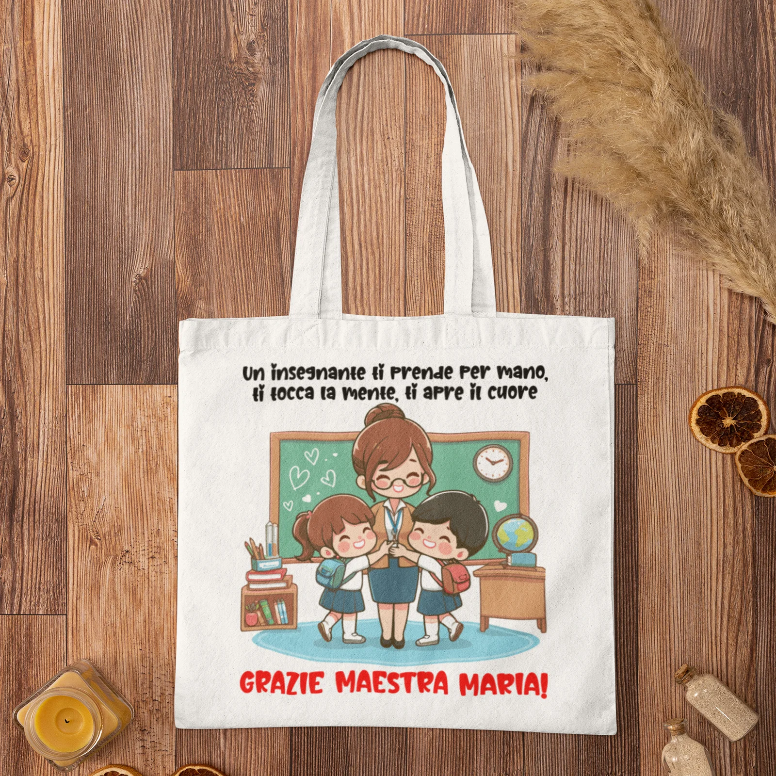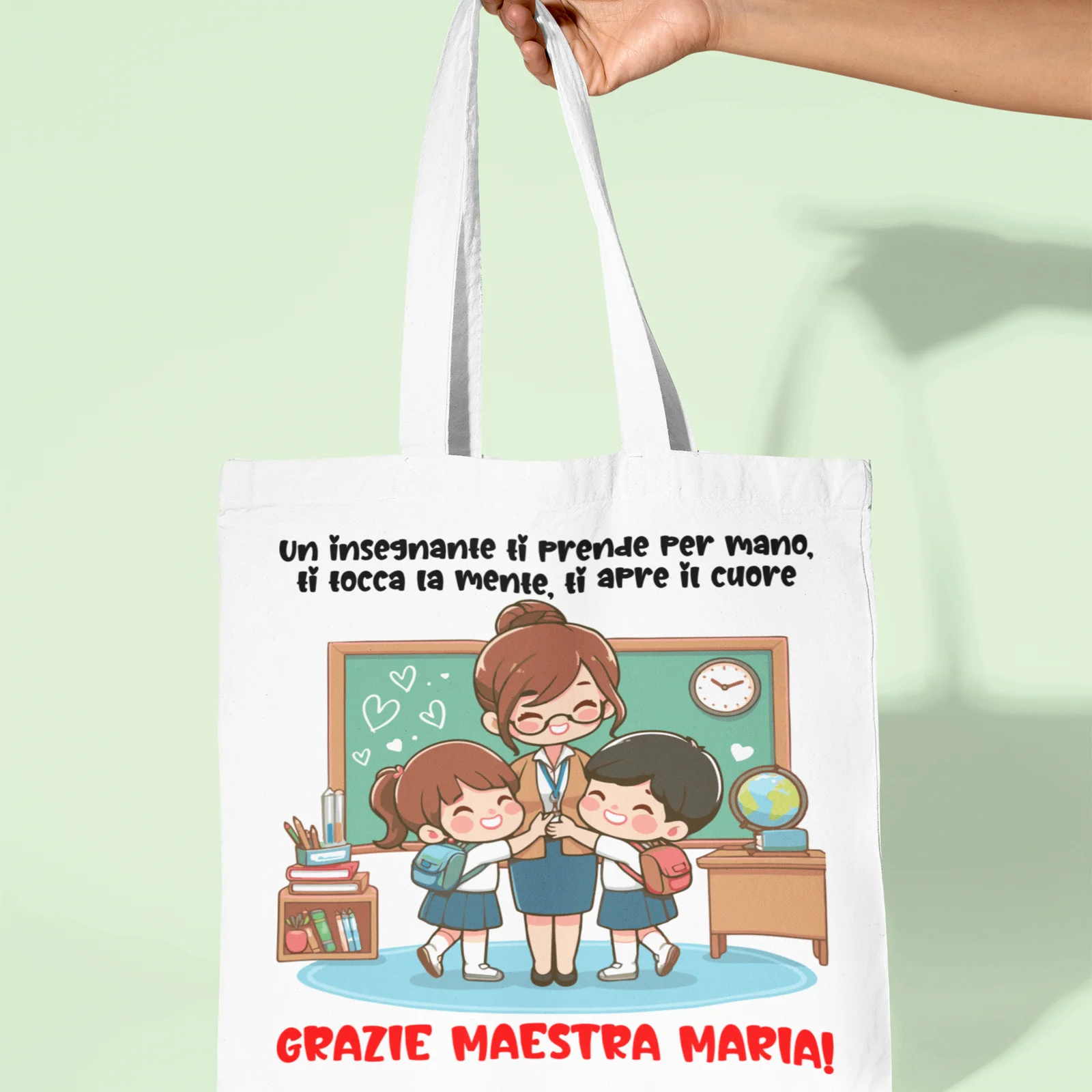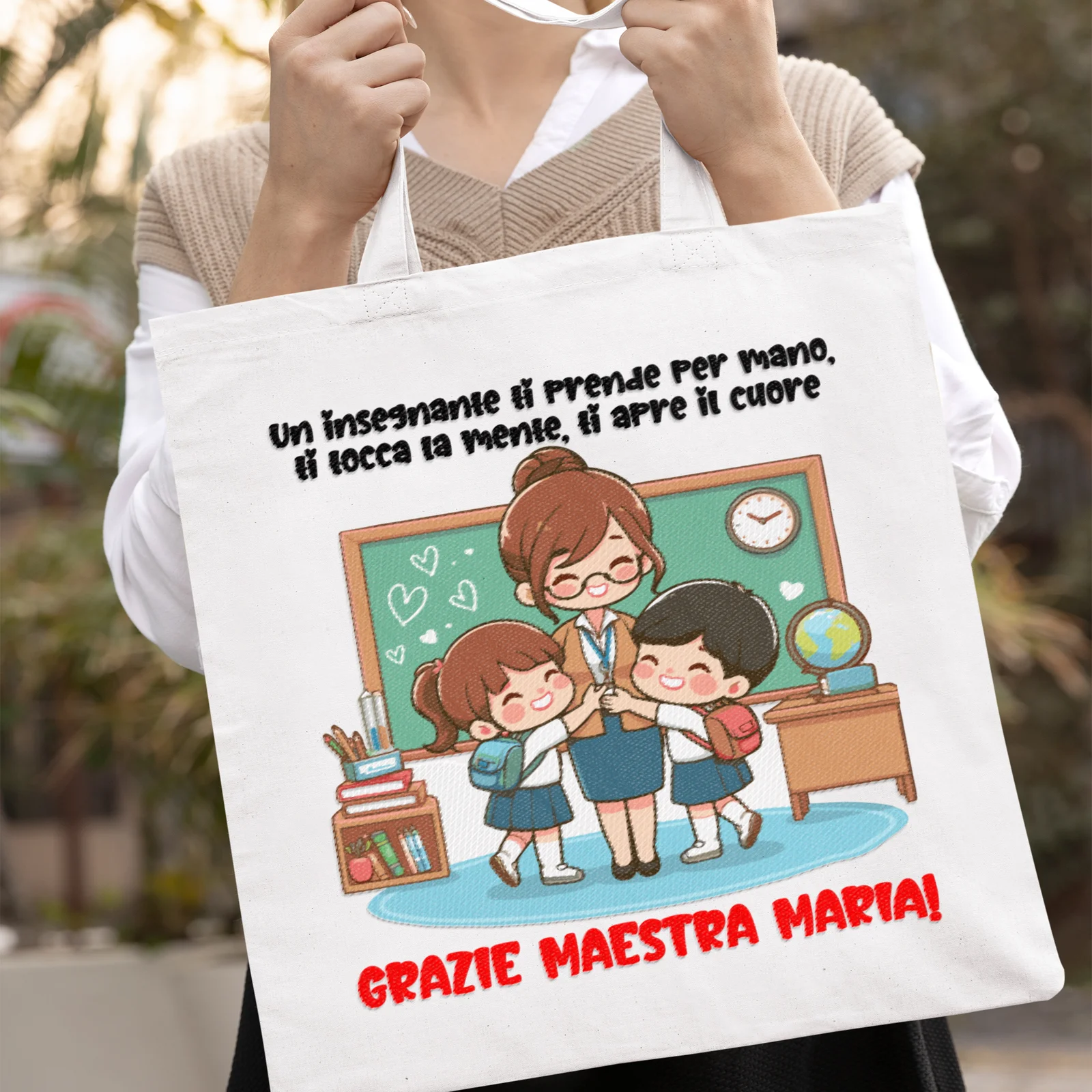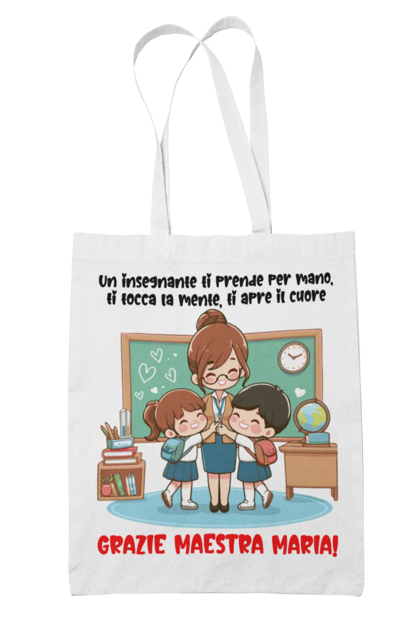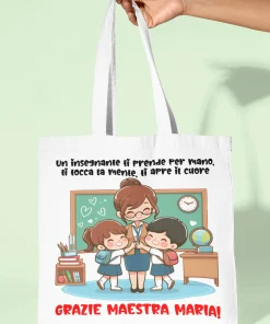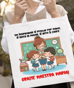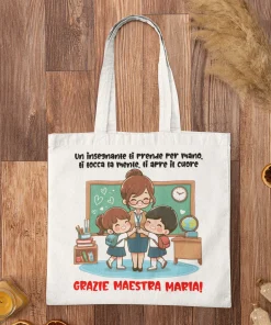 IDEA REGALO FINE ANNO SCOLASTICO: Scegli tra le tante grafiche a disposizione per festeggiare la tua maestra con questa divertente shopping bag in cotone idea regalo adatto per la fine dell’anno.