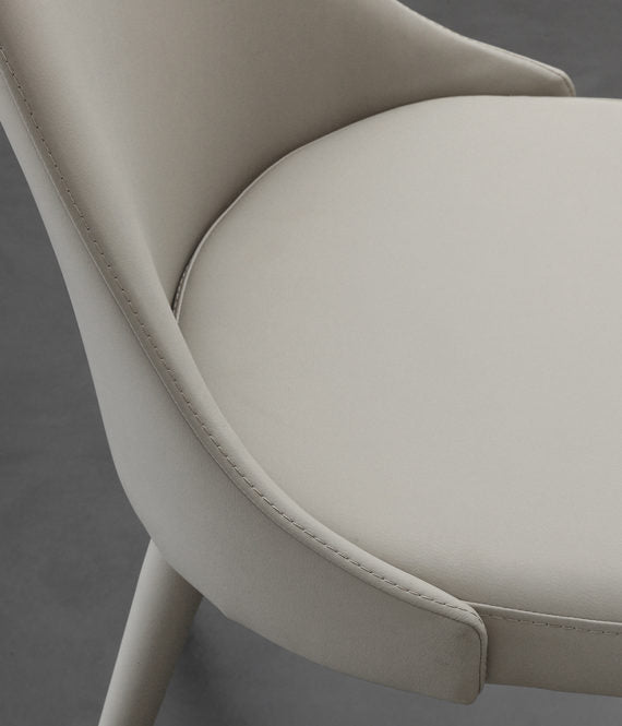 Sedia design moderno Sinfonia, confortevole ed elegante, utilizzabile per accompagnare il tavolo nella sala pranzo o per arricchire il salotto con un tavolo design. La sedia living è disponibile nei colori sabbia o titanio per la versione con struttura in tinta con la seduta, mentre per le gambe rivestite in ecopelle: sabbia o bianco.