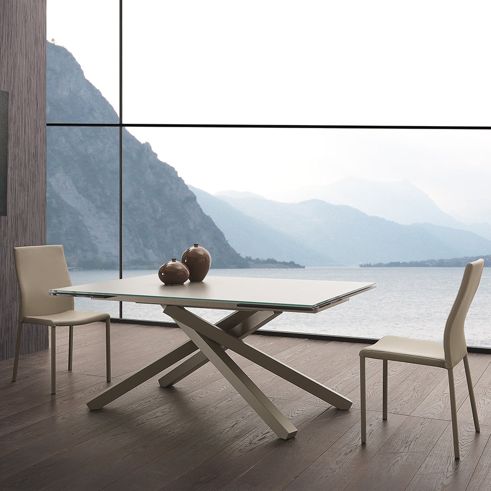 Siry – Tavolo allungabile piano in vetro gambe incrociate cm 160/240x106x76h